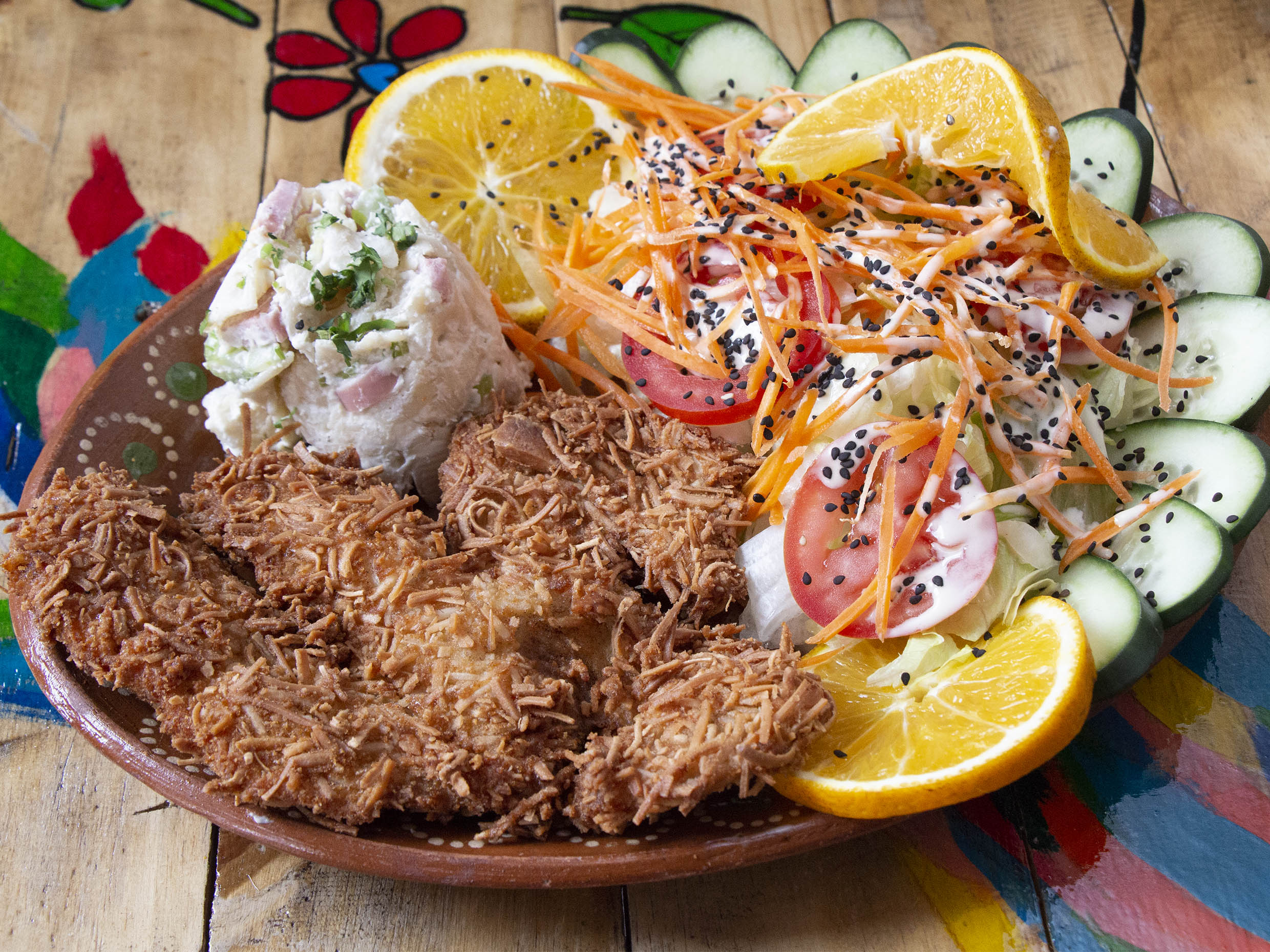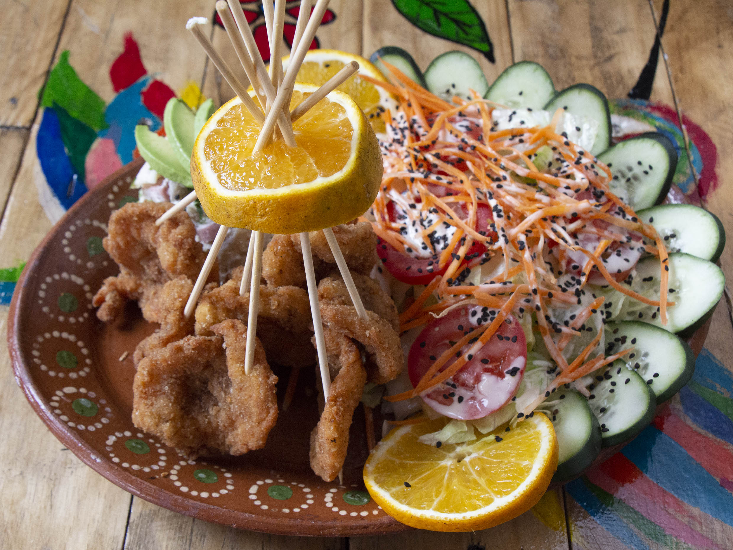 Camarones empanizados y Acompañados de ensalada, sopa fria y pan al gusto.