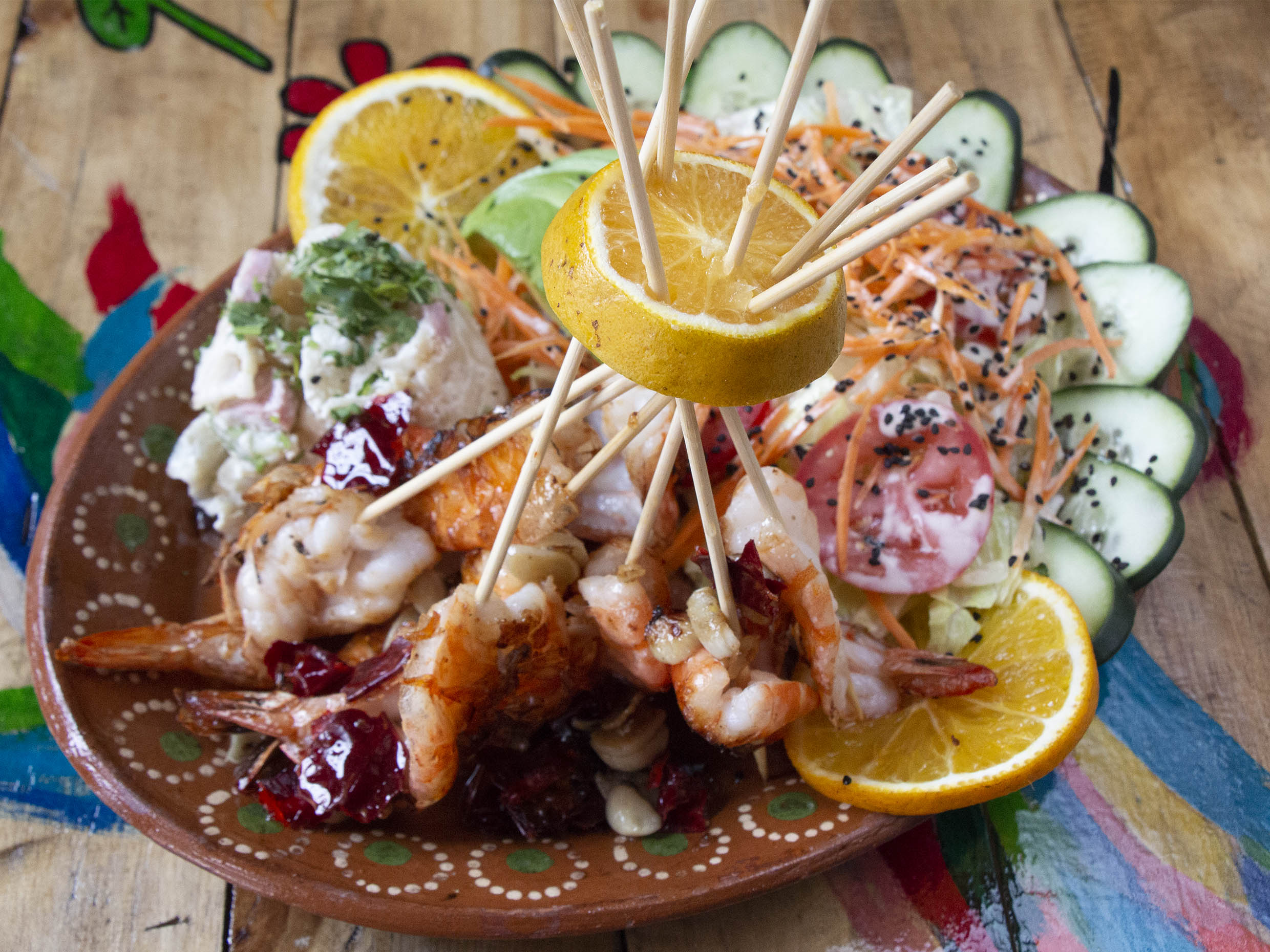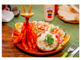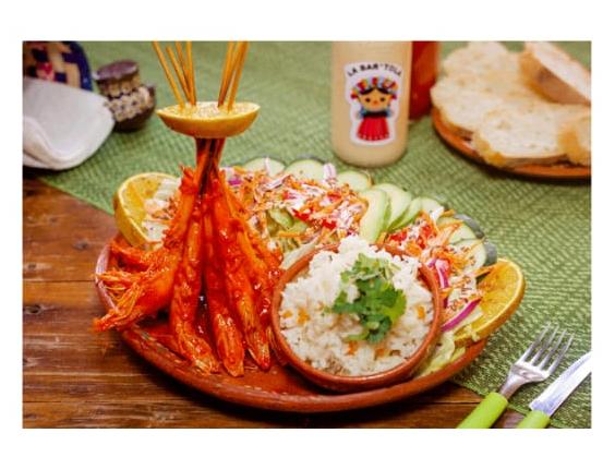 Camarones bañados con salsa picosa y Acompañados de ensalada, sopa fría y pan al gusto.