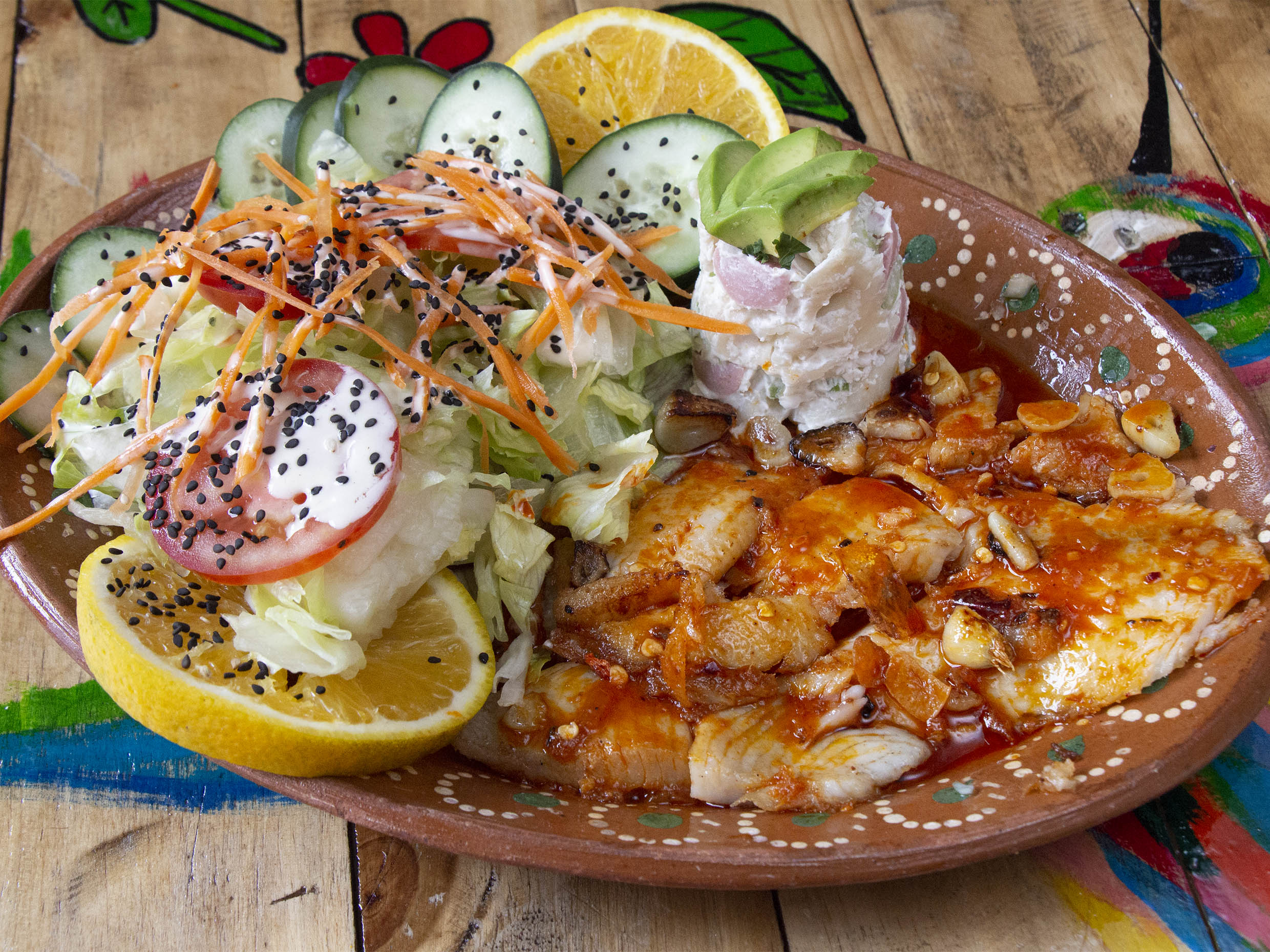 Filete de pescado con chile guajillo acompañado de ensalada, sopa fría y pan al gusto.