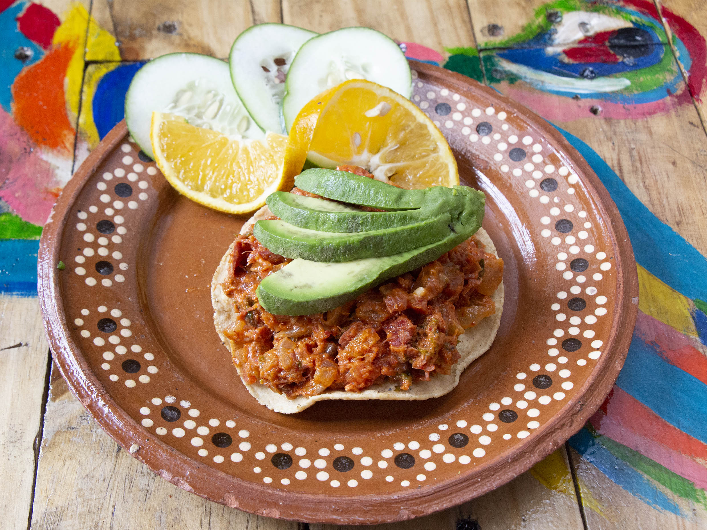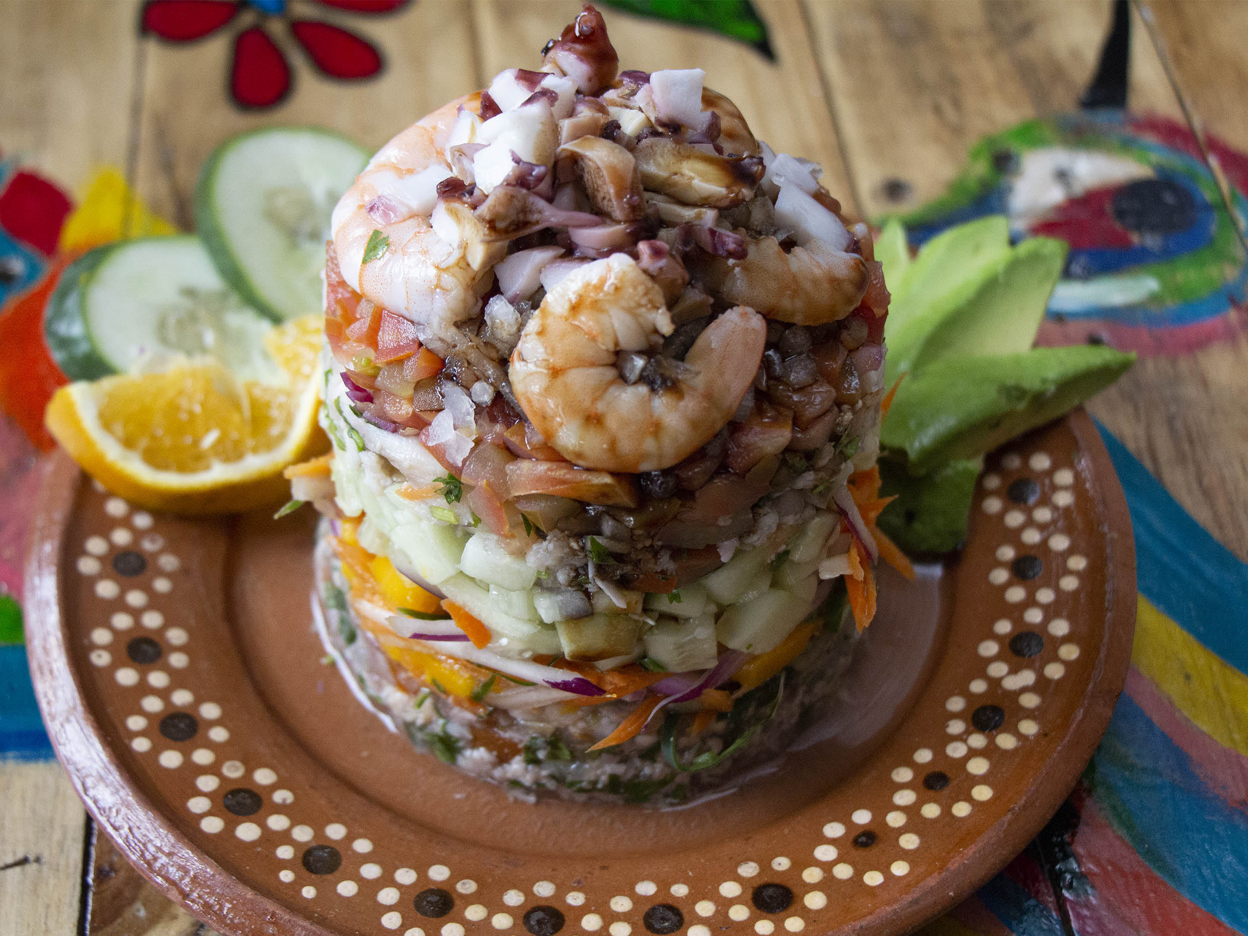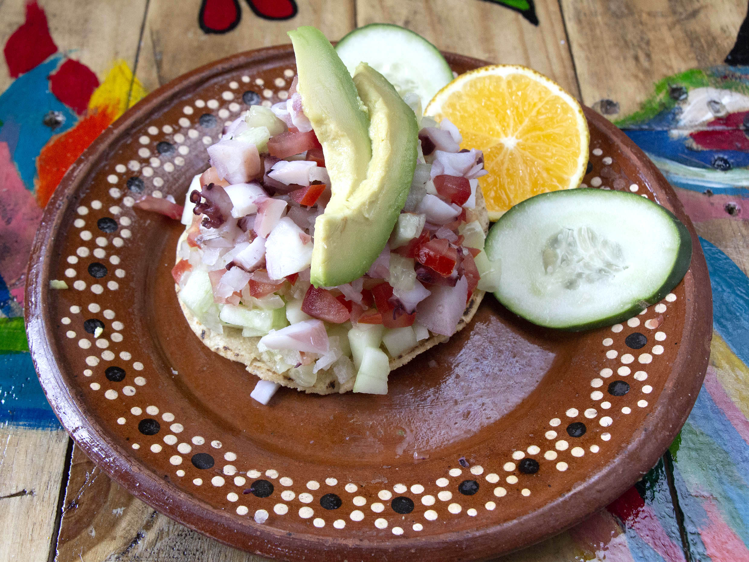 Jitomate, cebolla, pepino, pulpo y aguacate aderezado con salsa bruja (2 tostadas )