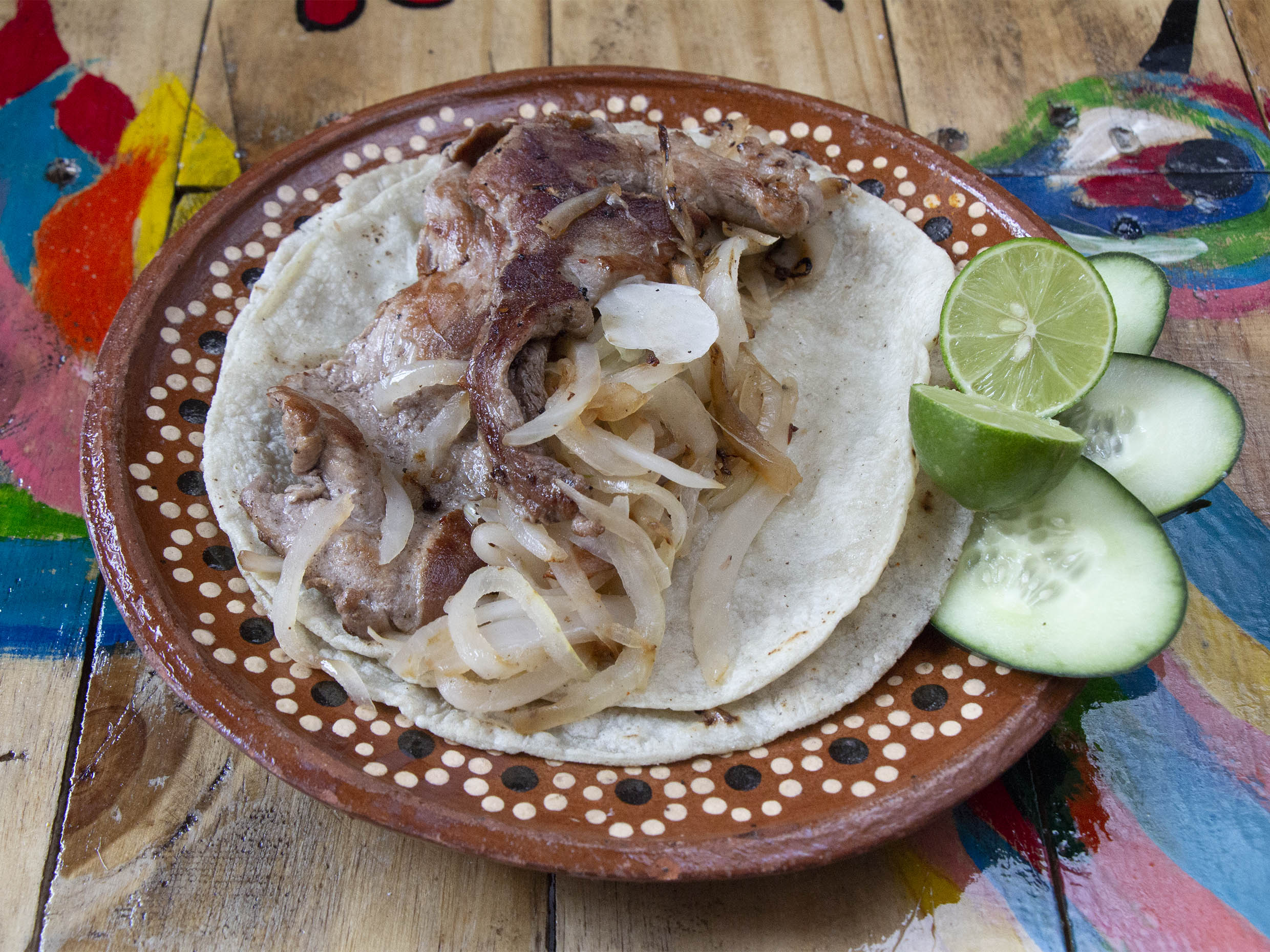 Tortillas hechas a mano, frijoles, chorizo, bistec y cebollitas y salsa