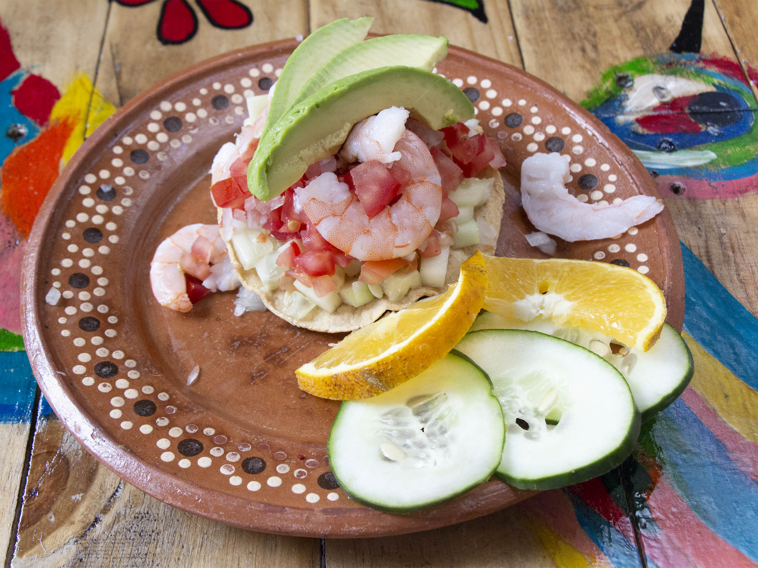 pepino, jitomate, cebolla, aguacate y camarones acompañado de salsas (2 tostadas )