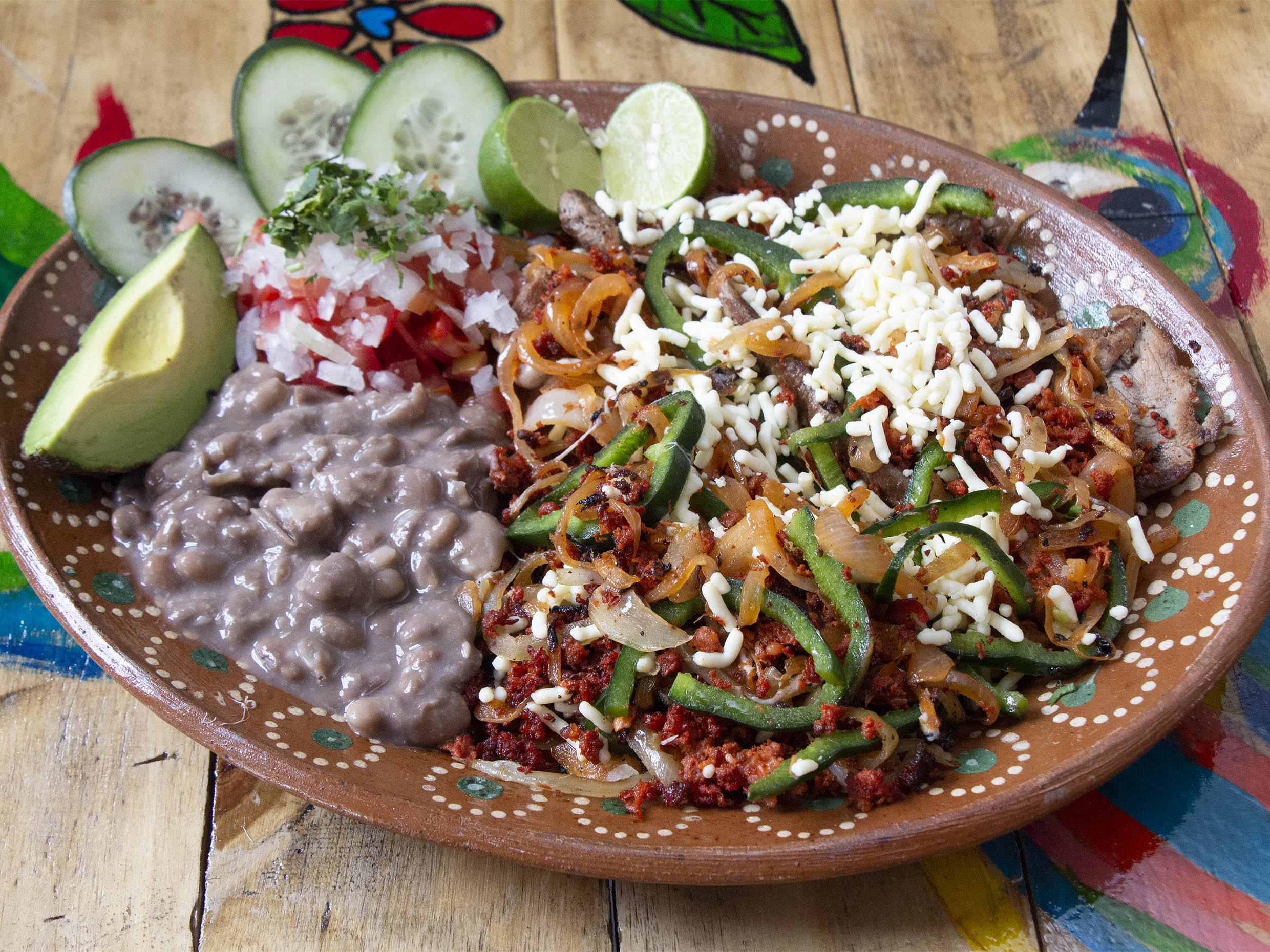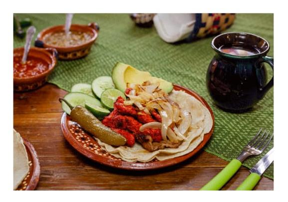 Acompañado de frijoles, pico de gallo y tortillas.