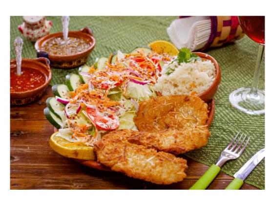 Camarones deliciosamente empanizados con coco rayado y Acompañados de ensalada, sopa fría y pan al gusto.