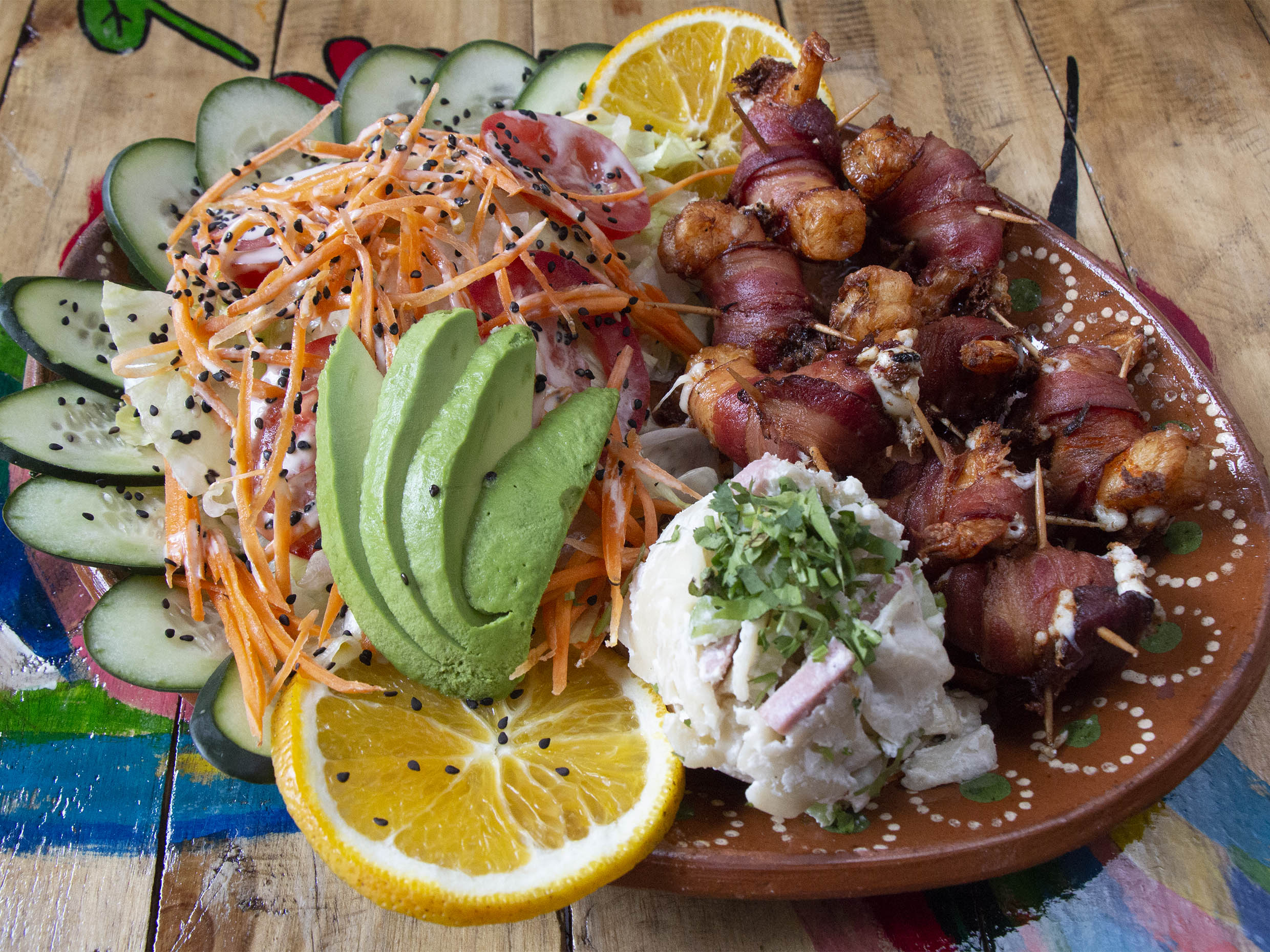 Camarones rellenos de queso y envueltos de tocino y Acompañados de ensalada, sopa fría y pan al gusto.