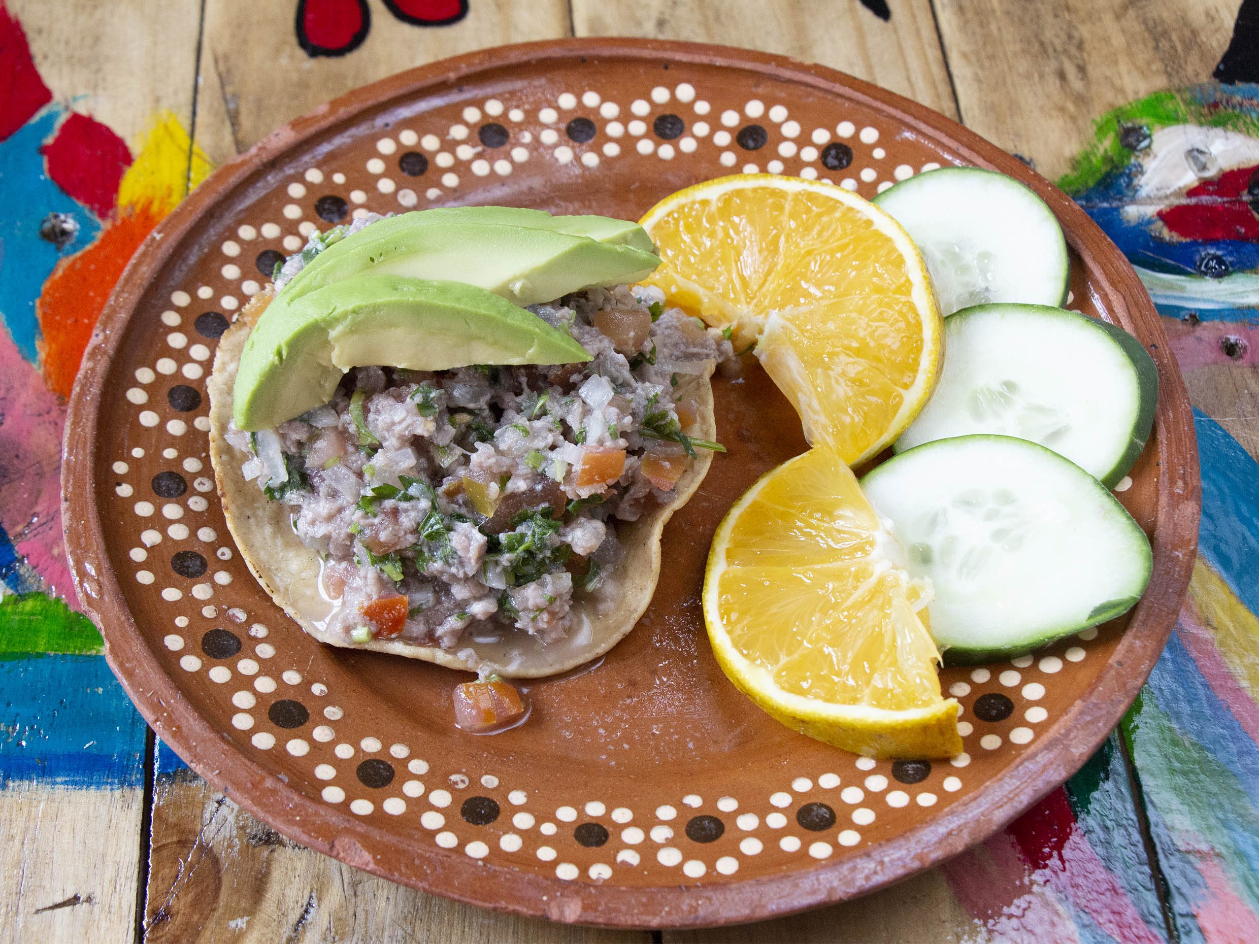 Carne de res cocida en limón con jitomate, cebolla, cilantro y aguacate acompañado con salsas (2 tostadas)