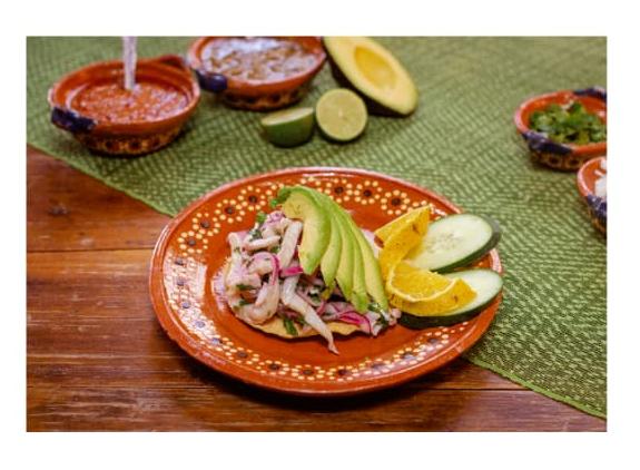 Pescado cocido en limón con jitomate, cebolla , cilantro y aguacate acompañado de salsas (2tostadas)