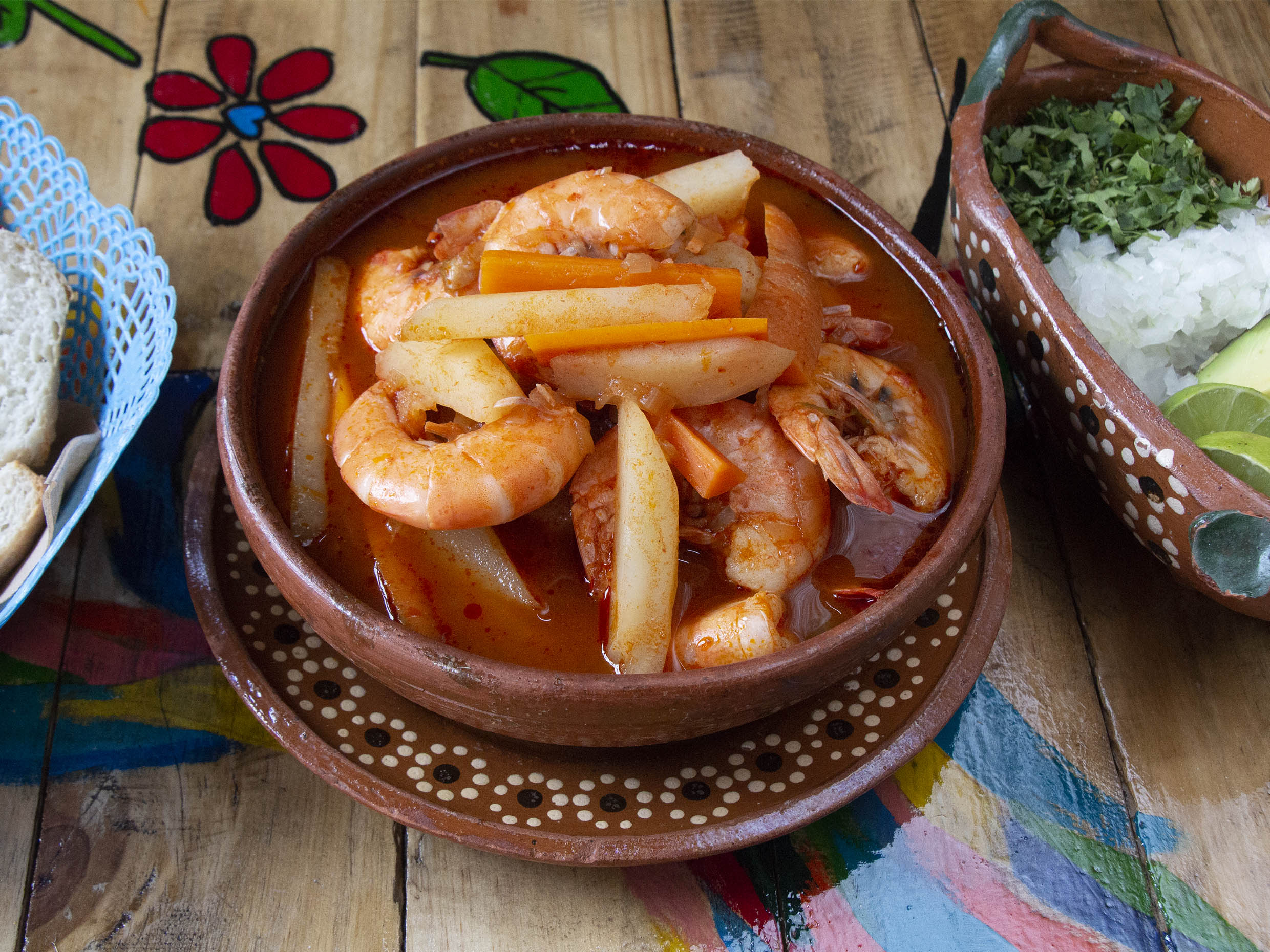 Delicioso Caldo de camarón con pan al gusto.