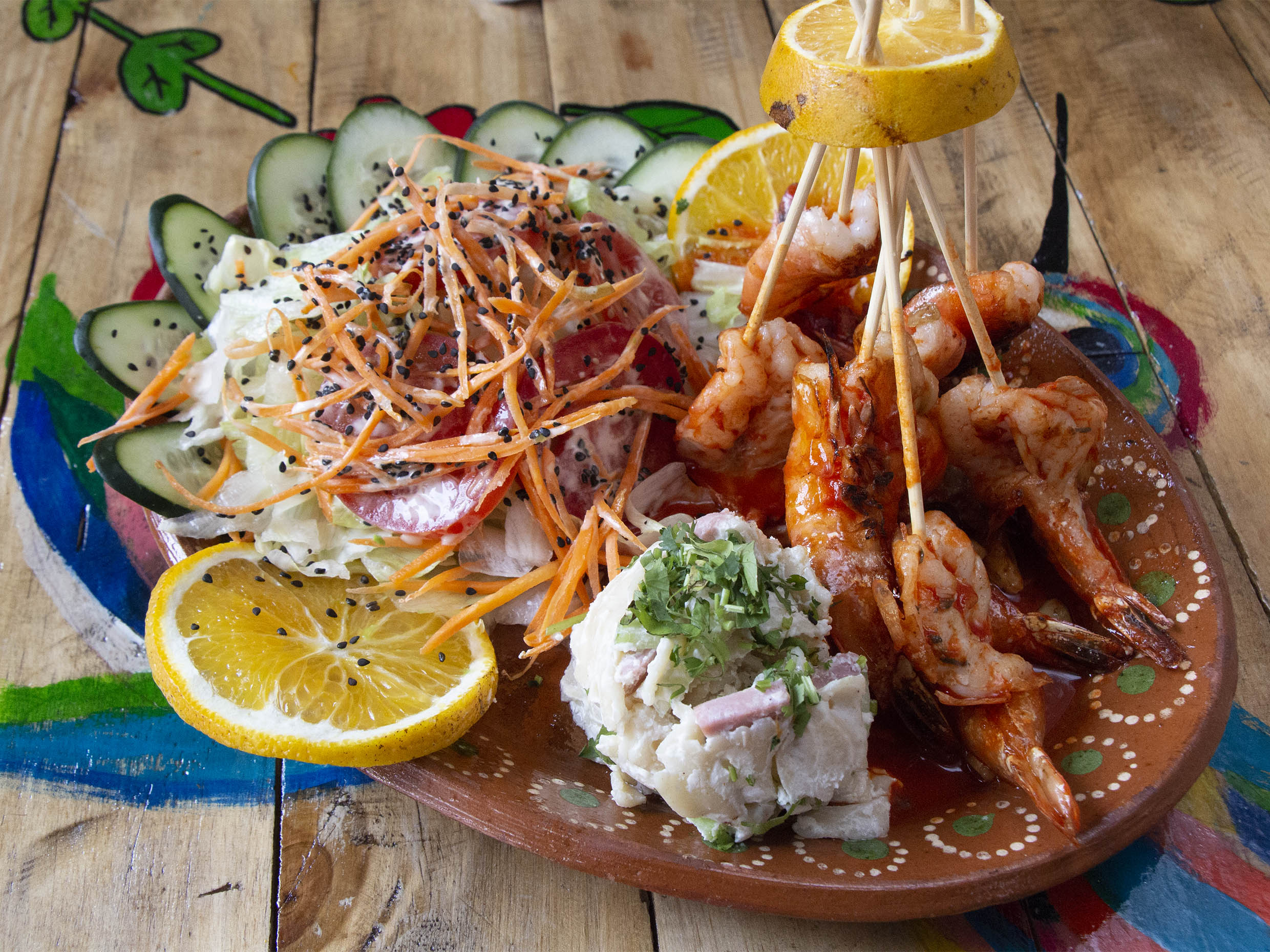 Camarones aderezados con aceitito de ajo y pequeños trozitos Acompañados de ensalada, sopa fría y pan al gusto.