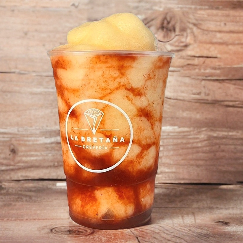 Bebida frappeada a base de agua, sabor mango, decorada con chamoy y miguelito.