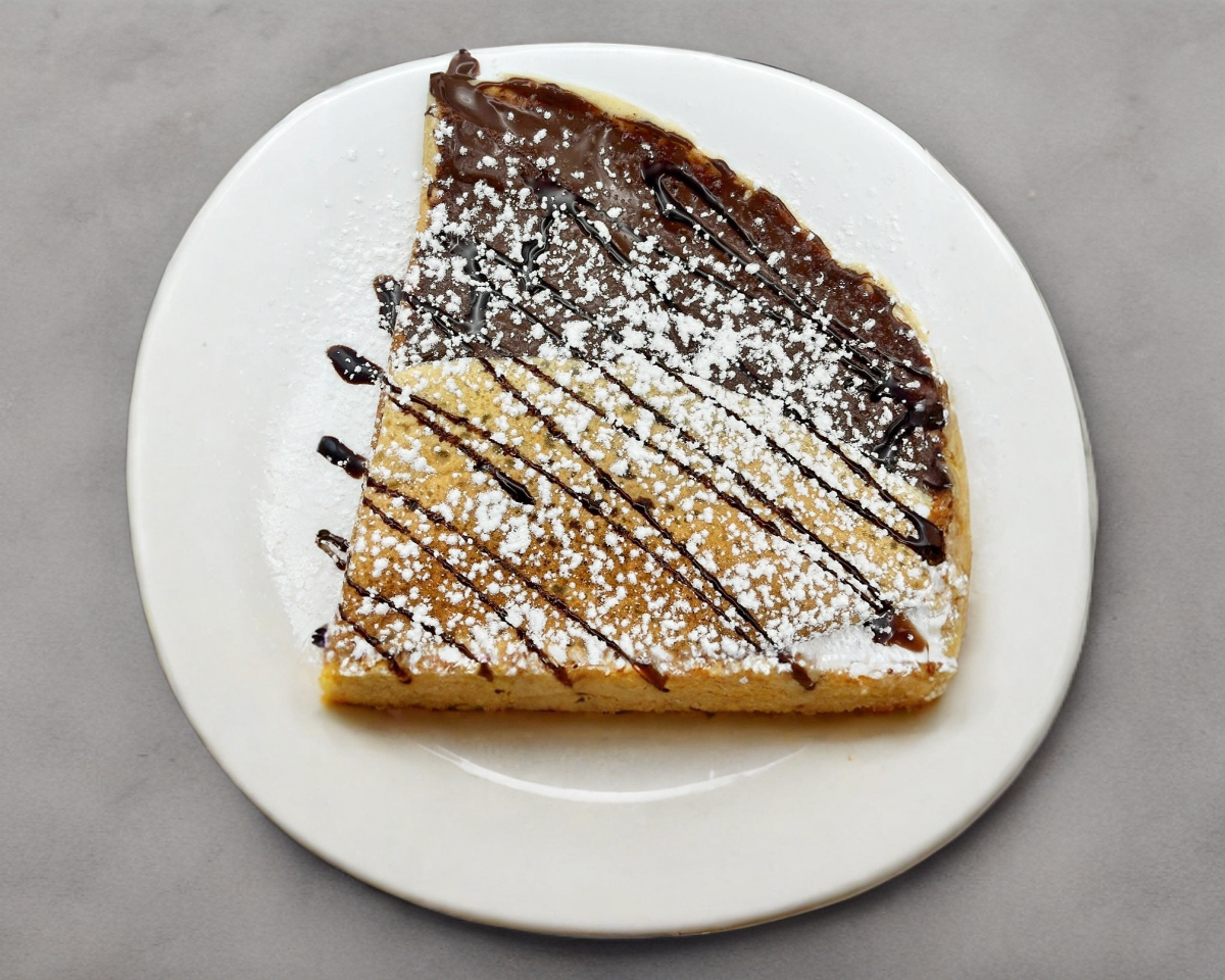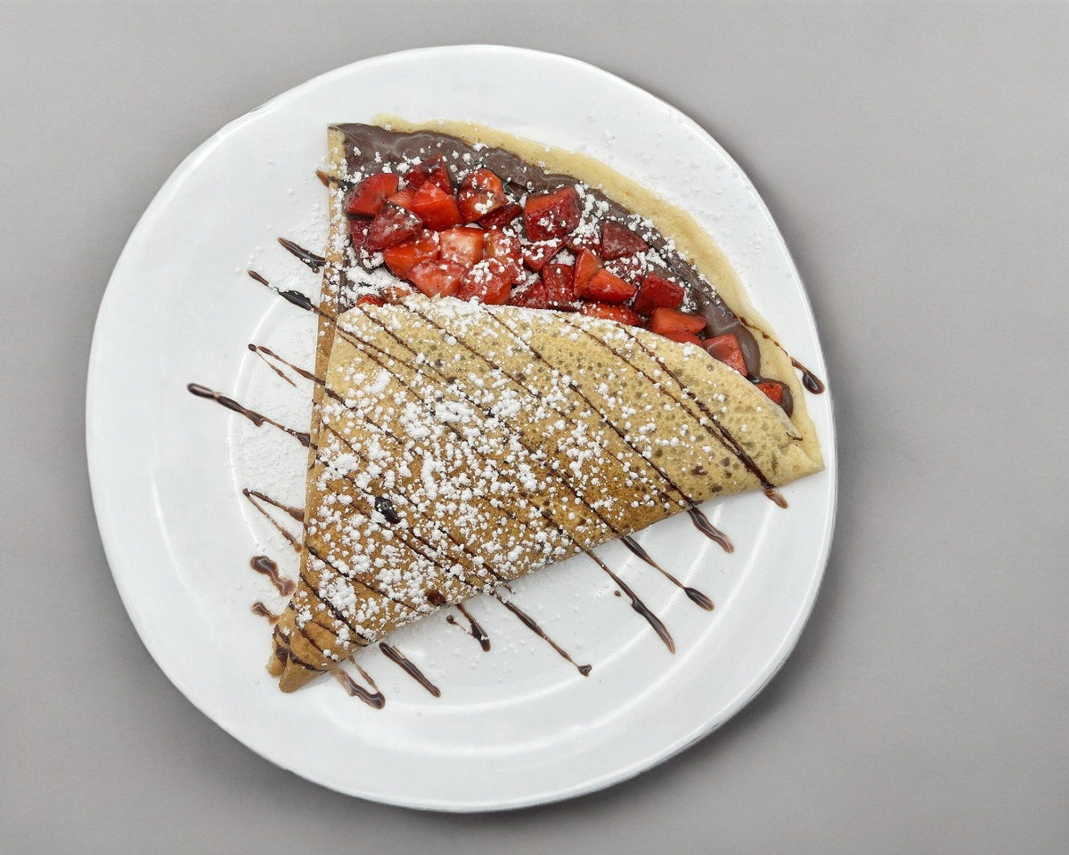 Crepa rellena de Nutella con trocitos de fresa natural y decoración a elegir.