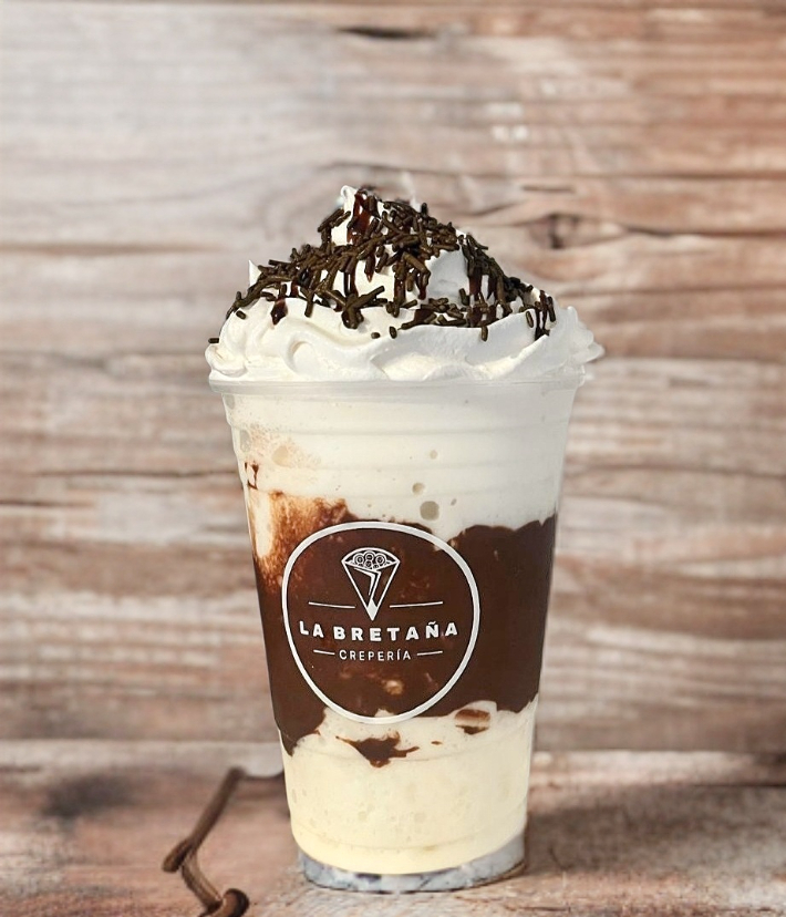 Chocolate blanco hecho frappe, a base de leche. Decorado con un espiral de nutella, topping de crema batida, espiral de chocoalte y chispas.