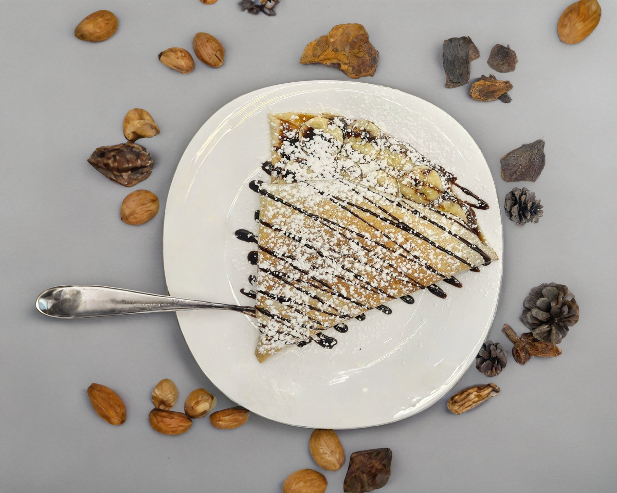 Crepa rellena de Nutella y rodajas de plátano, cubierta con decoración a elegir.