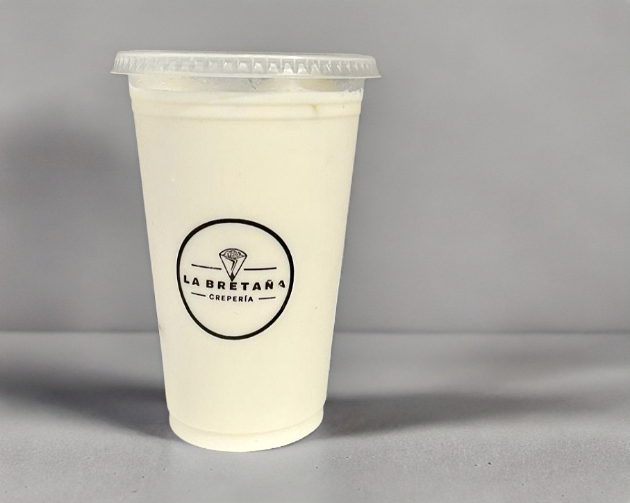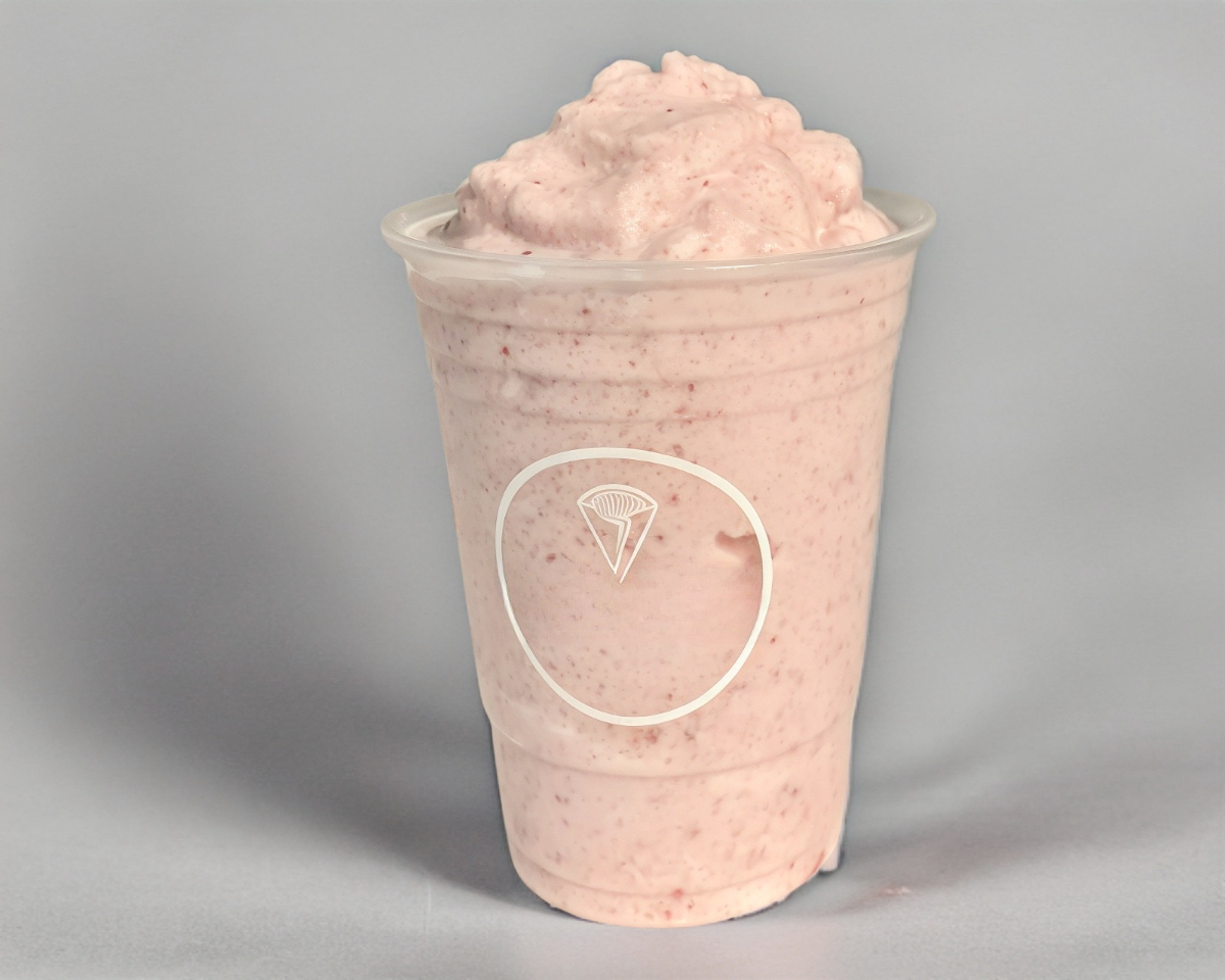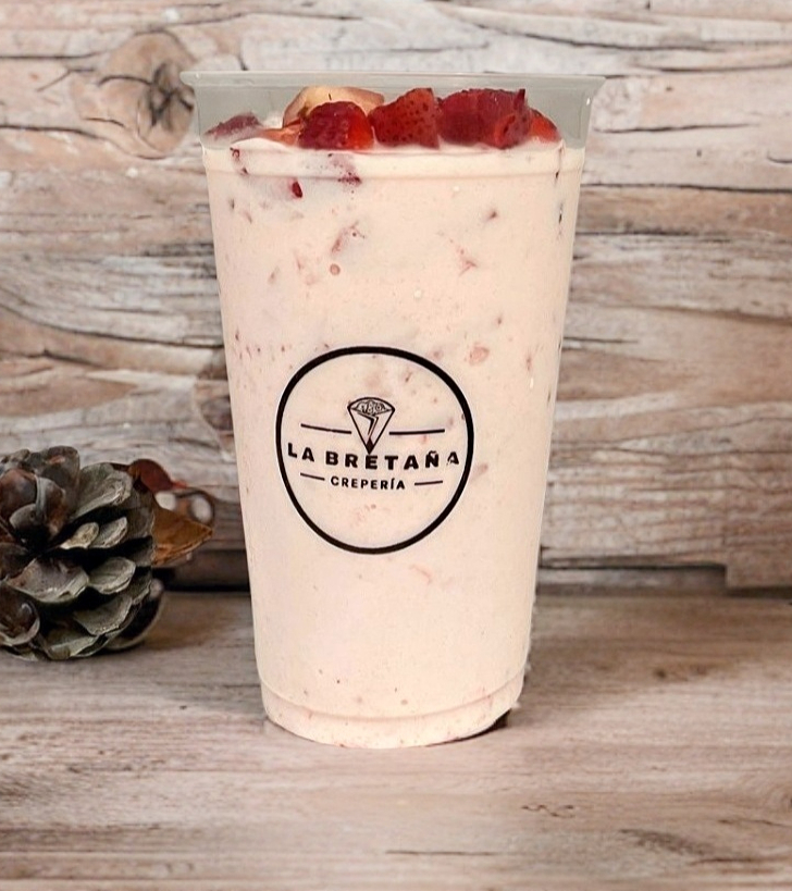 Bebida frappeada hecha con trocitos de fresa natural, leche y un toque dulce.