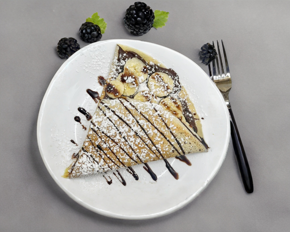 Crepa rellena de rodajas de plátano y cajeta quemada, cubierta de decoración a elegir.