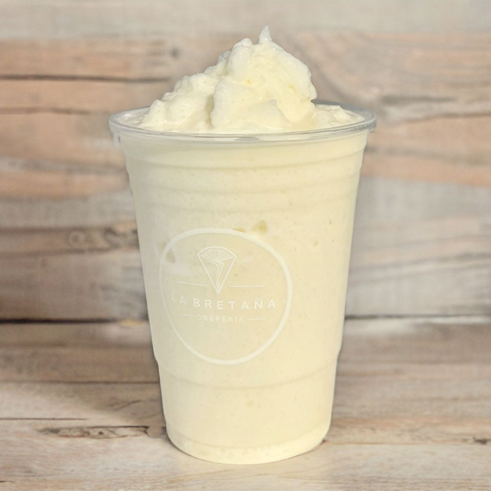 Bebida frappeada hecha con trocitos de piña, leche y un toque dulce.