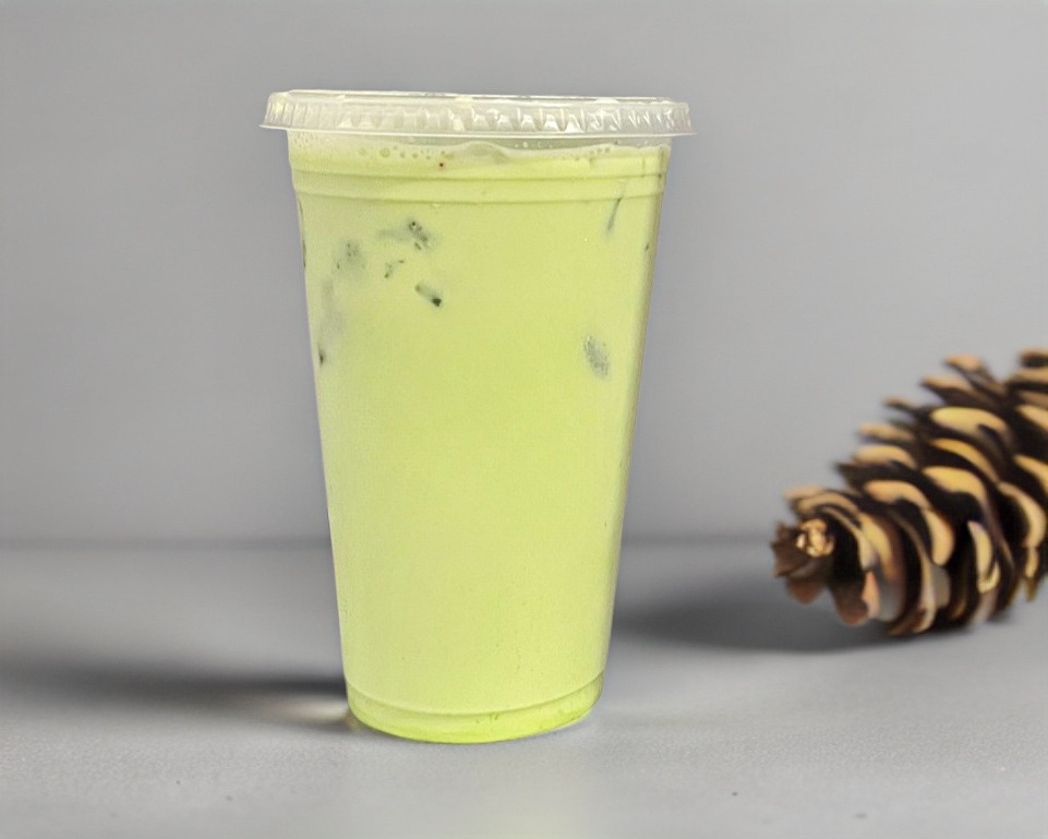 A base de leche, matcha frappeado con un topping de crema batida y polvo matcha.