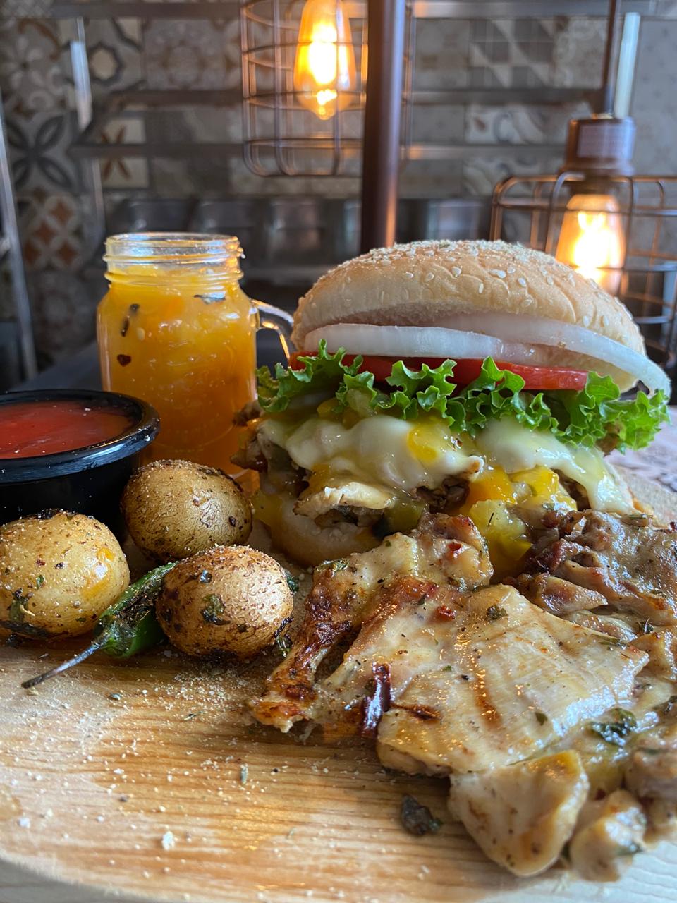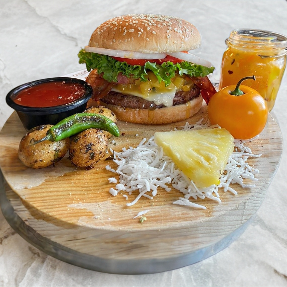Consiente tus sentidos con una jugosa carne de sirloin de 120 gramos, queso suizo, combinada con nuestro exquisito aderezo de piña y coco, cebolla caramelizada, piña asada, tocino, mezcla de lechugas y vegetales frescos.
