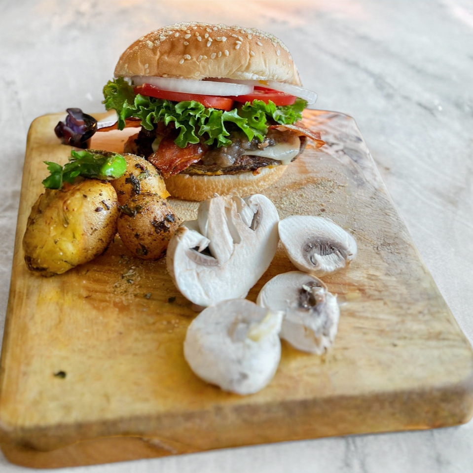 Deliciosa carne de sirloin de 120 gramos acompañada de nuestra famosa salsa de champiñones al vino tinto, tocino, cebolla caramelizada, queso suizo y queso americano gratinado, mezcla de lechuga y vegetales frescos.