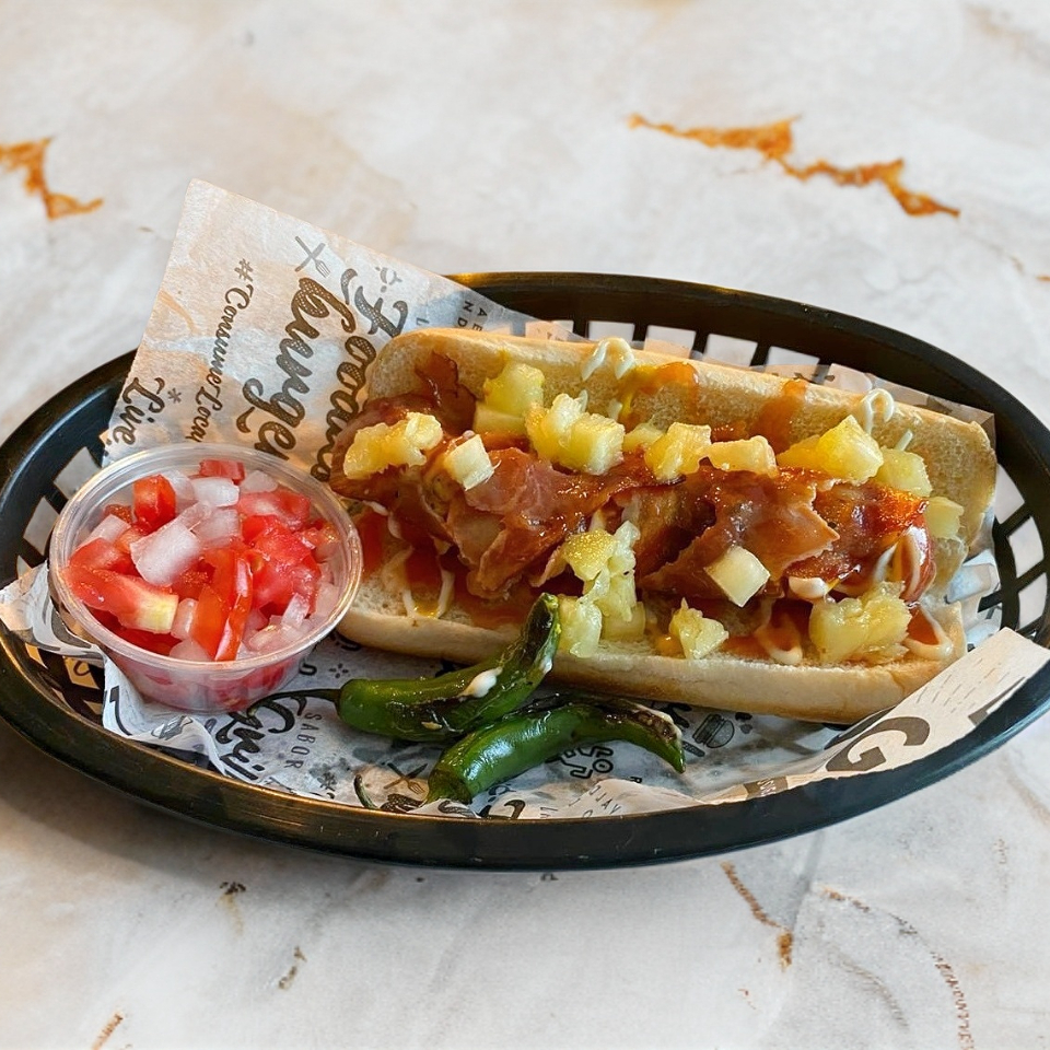 Salchicha de pavo al grill, cebolla caramelizada, tocino y piña.