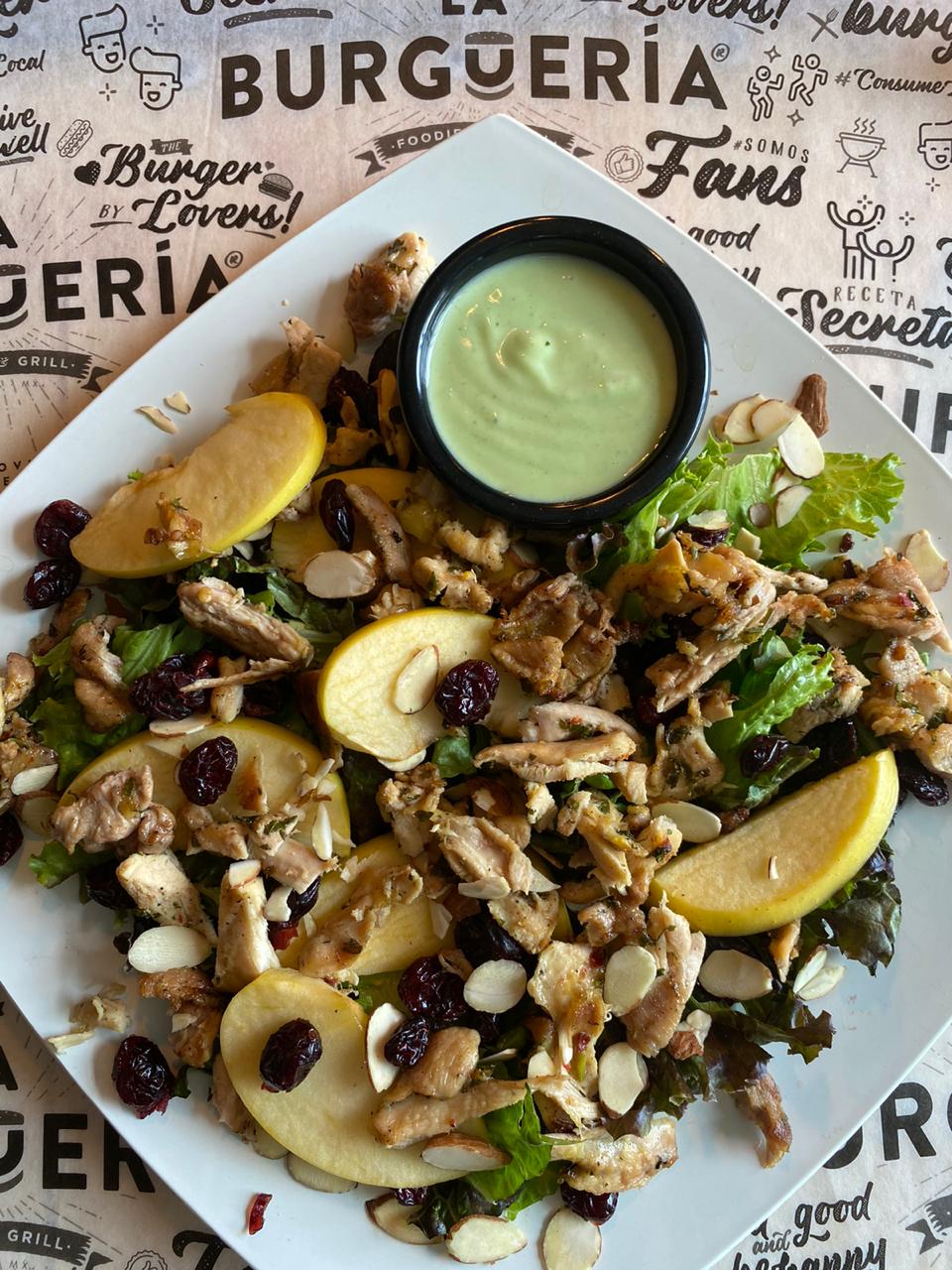 Te recomendamos nuestra ensalada de pollo al grill, lechugas tiernas, manzana, arándanos, almendras fileteadas y nuestro aderezo secreto.
