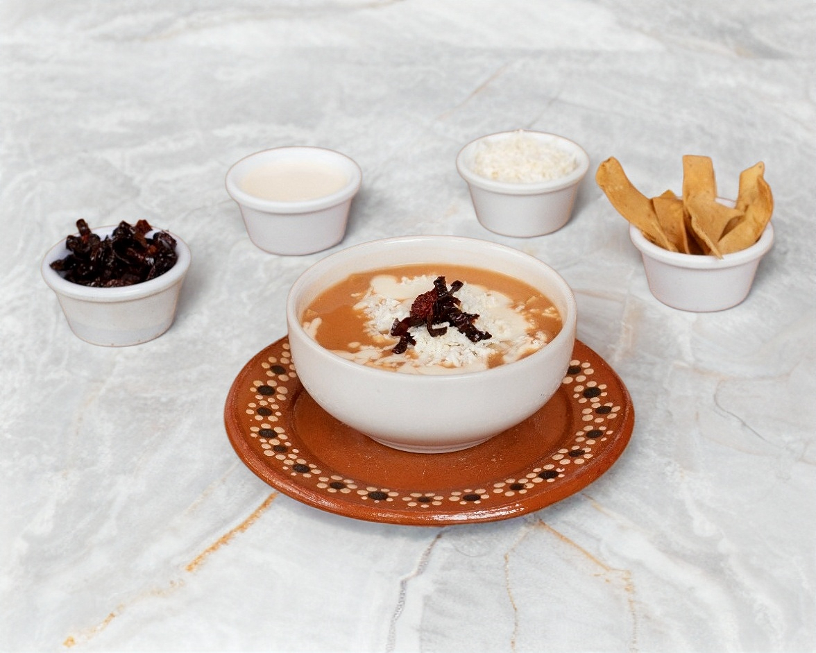 Una receta de mucho sabor, acompañada con tortilla frita, queso, crema y chile seco doradito.