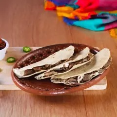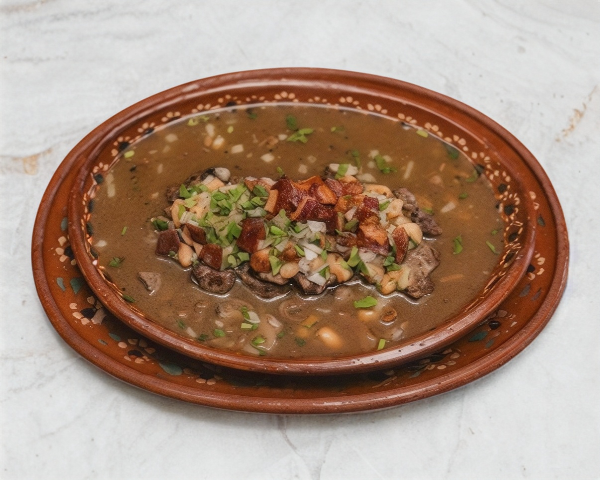 Nuestra especialidad acompañada de tocino, cebolla, cilantro, frijoles de la olla, bañada en nuestro jugo de carne con salsas, tortillas, frijoles refritos y limones.