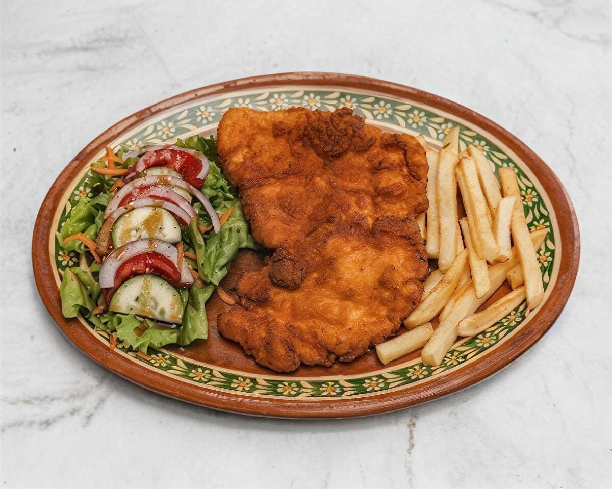 Crujiente empanizado servido con papas a la francesa y ensalada. Incluye salsas, tortillas, frijoles refritos y limones.