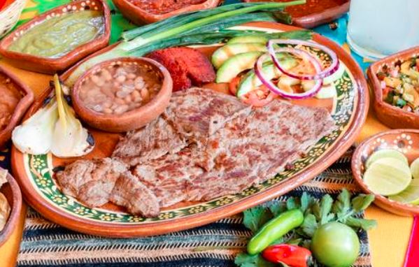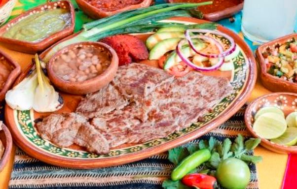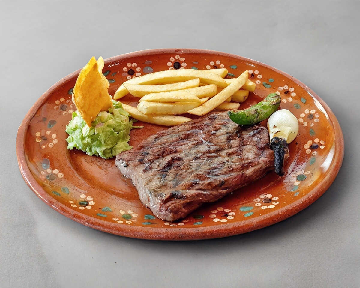 Corte marinado acompañado de guacamole y papas a la francesa. Incluye salsas, tortillas, frijoles refritos y limones.
