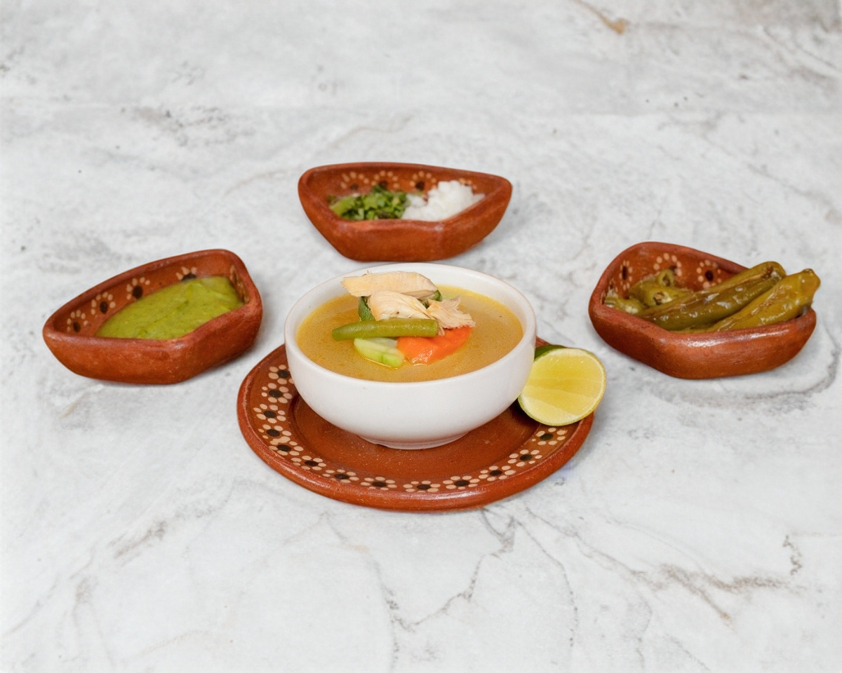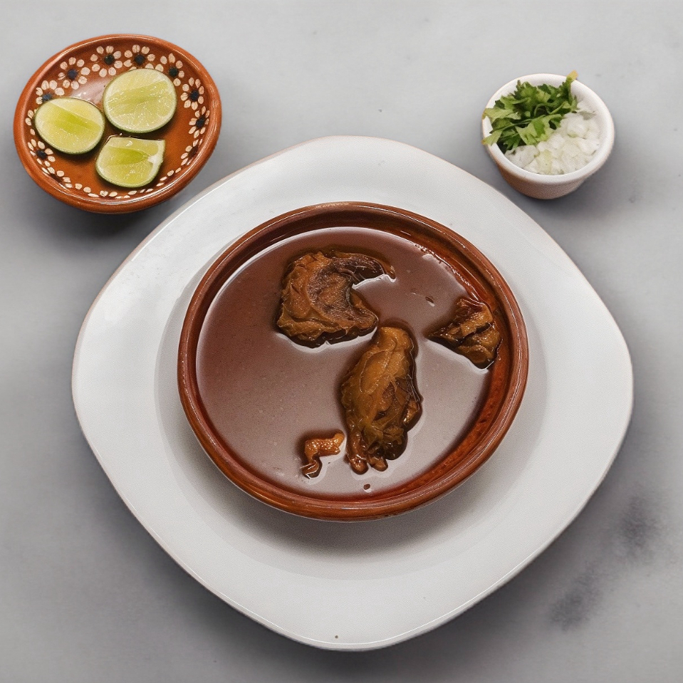 Caldito guisado con chile seco acompañado de tortillas y limones.