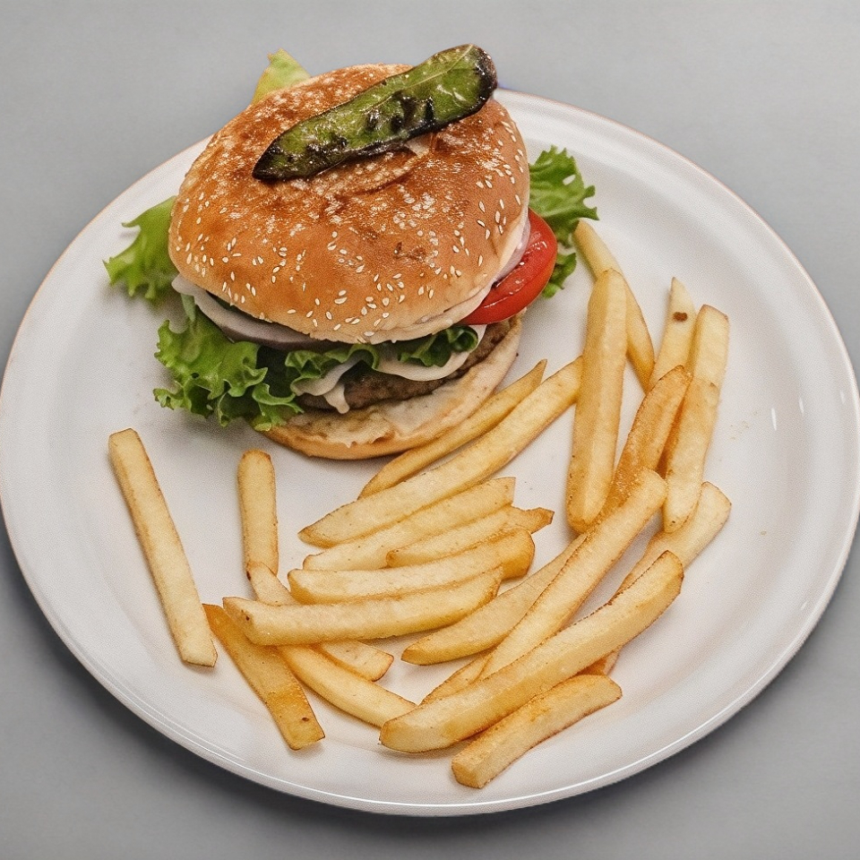 150 grs de carne sirloin, queso, tocino, lechuga, jitomate y cebolla ,servido con papas a la francesa. Incluye cátsup y mostaza.