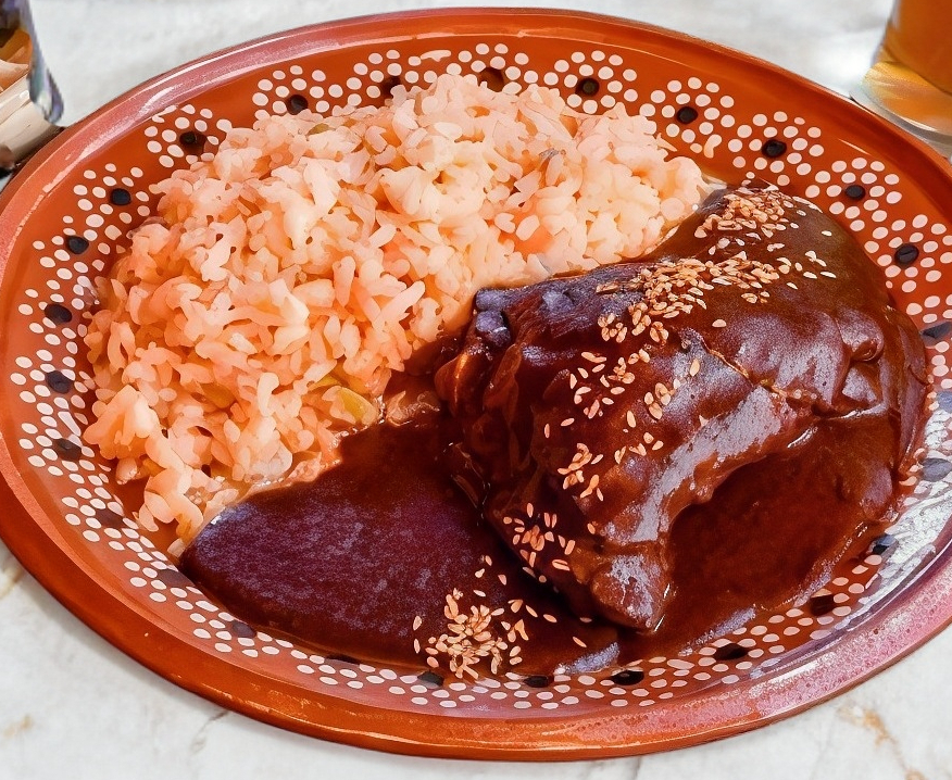 Mole hecho en casa acompañado de arroz y pierna con muslo. Incluye salsas, tortillas, frijoles refritos.