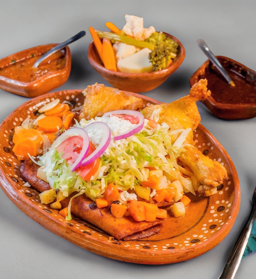 Servida con arroz, enchilada placera, guacamole y queso asado. Incluye salsas, tortillas, frijoles refritos y limones.