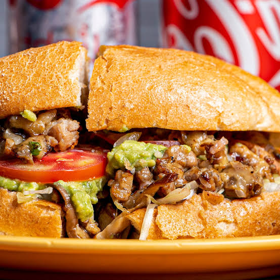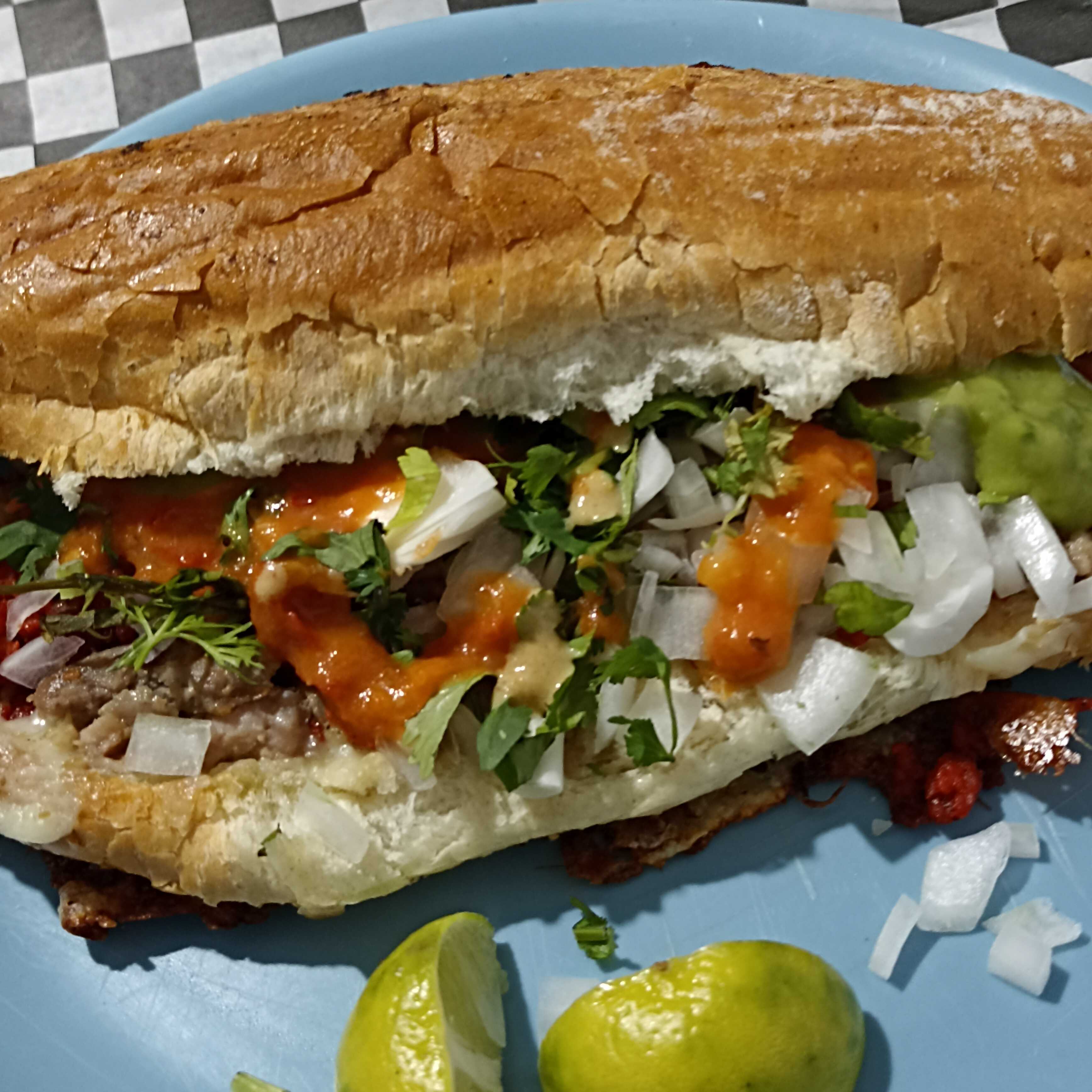 Bolillo doradito, con queso derretido, bistec, cebollas asadas