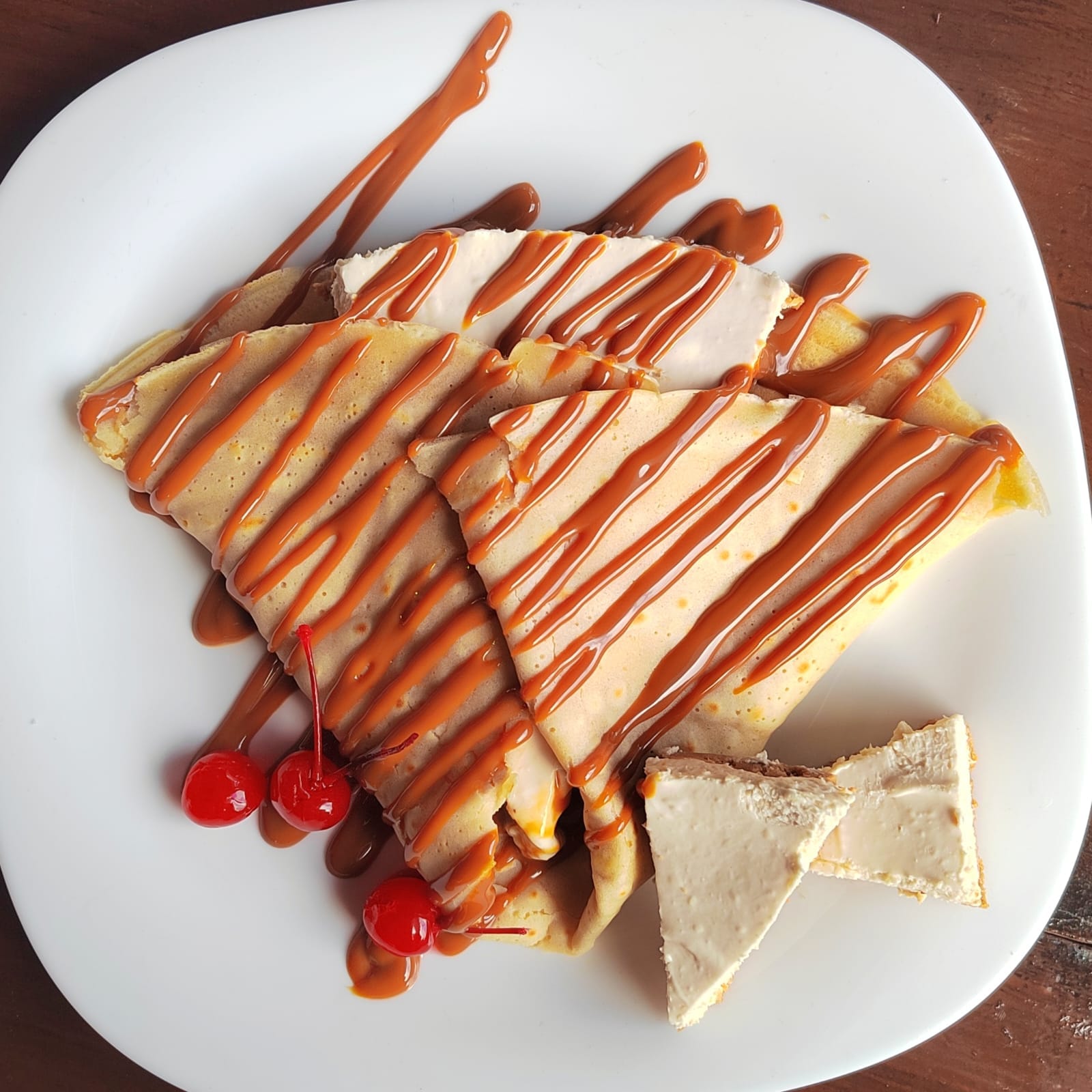 Lo mejor de dos postres deliciosos, rebanada de CheeseCake casero de La Cabaña envuelta en una crepa y cubierta con dulce de leche