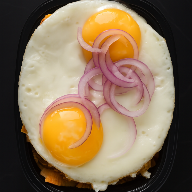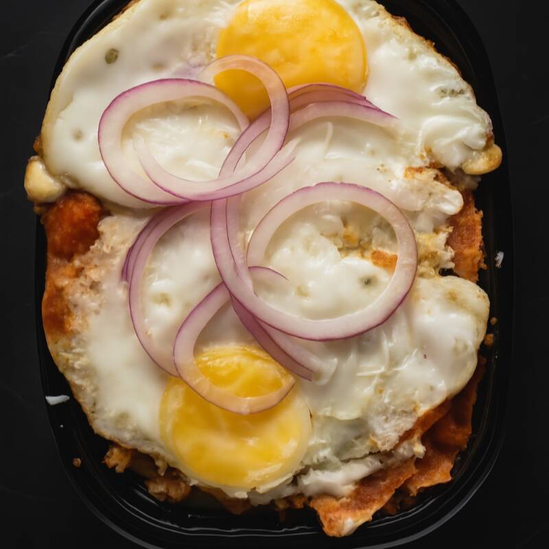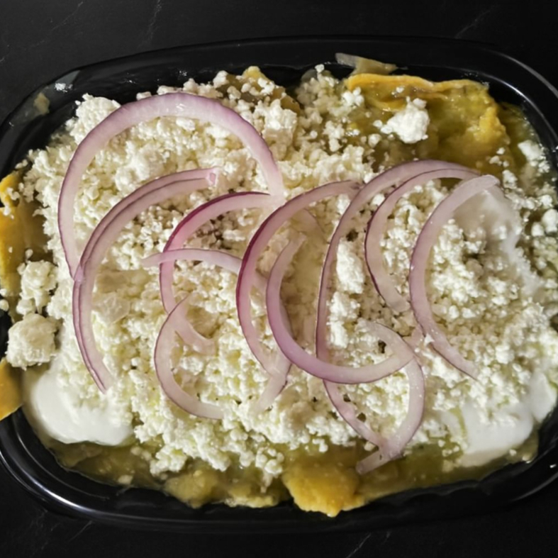 Media ordes Chilaquies acompañados de crema, queso ranchero y cebolla.