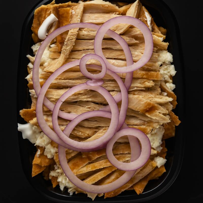 Media orden Chilaquiles acompañados de crema, queso ranchero y cebolla.