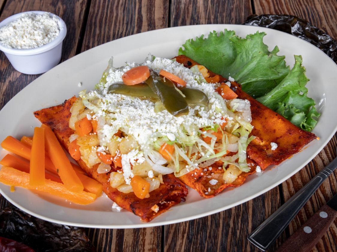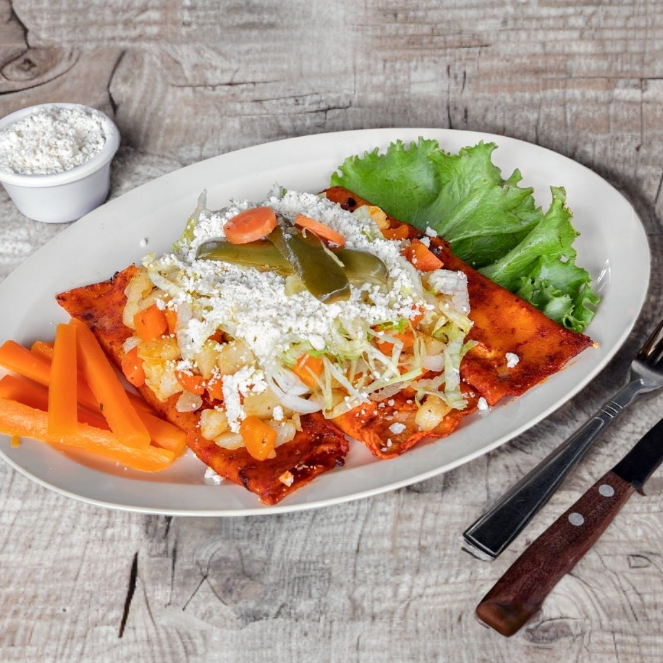 Elaborados con chile guajillo, rellenas de res con queso y sobre ellas lechuga, papa, zanahoria, queso y chiles en vinagre