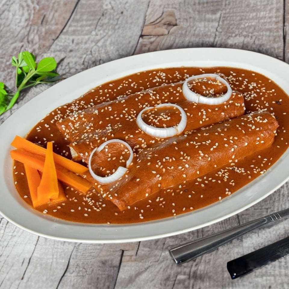 Elaboradas con mole, rellenas de pollo y sobre ellas ajonjoli y rodajas de cebolla
