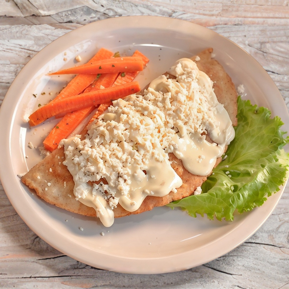 Elaboradas con salsa de poblano con crema, rellenas de pollo y sobre ellas queso oaxaca gratinado