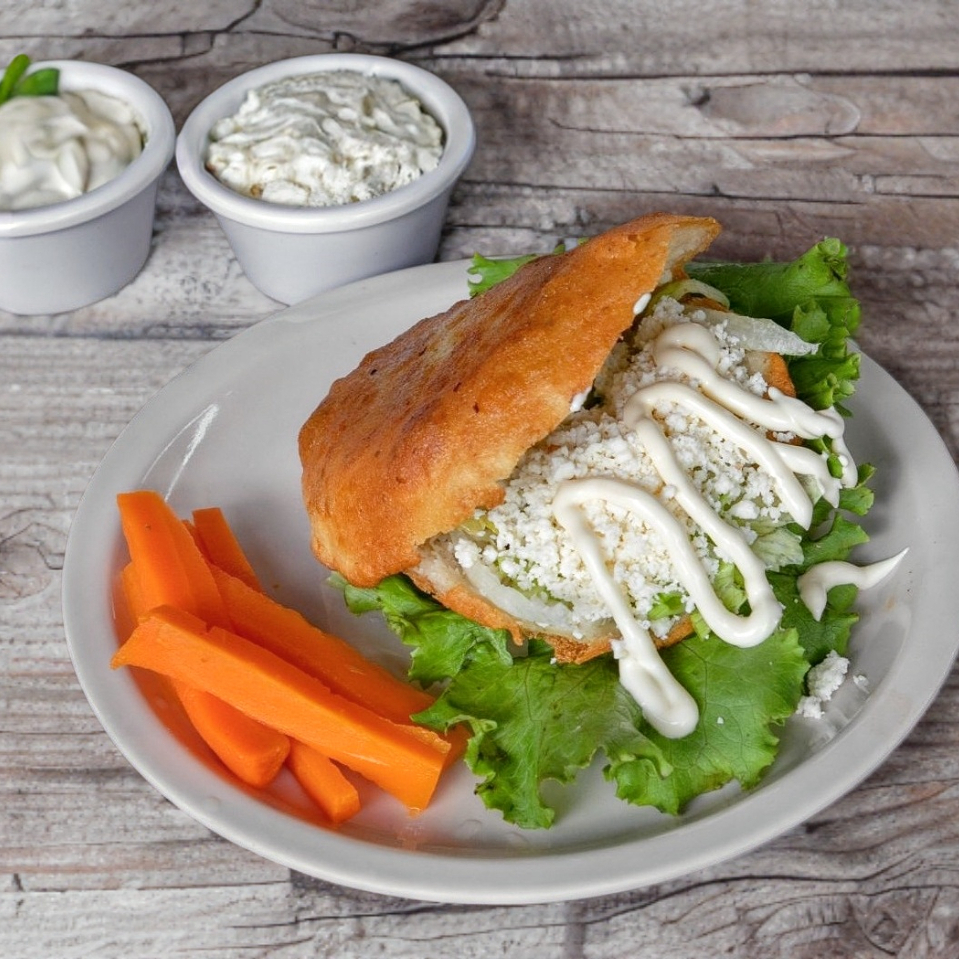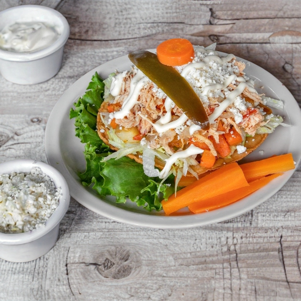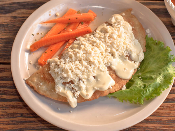 Elaboradas con salsa tomate, rellenas de pollo y sobre ellas lechuga, queso y crema