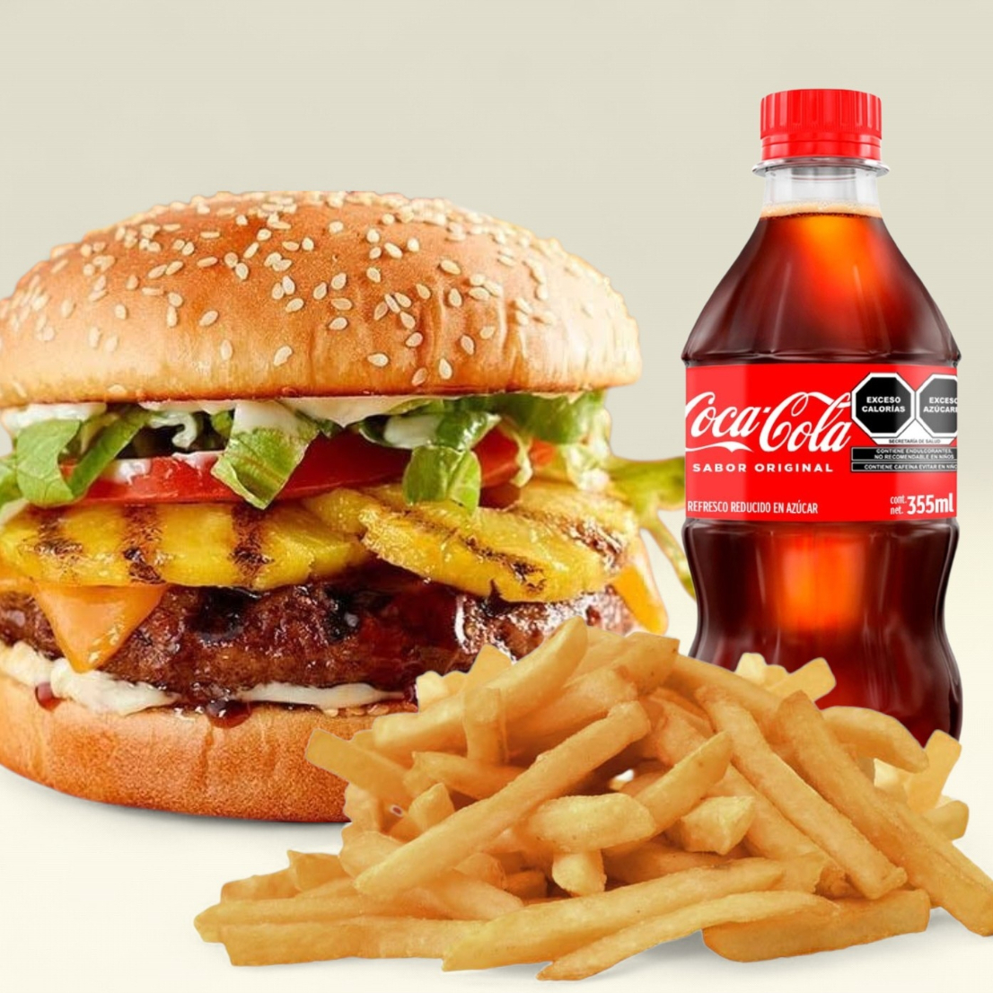 COMBO HAWAIANO FLIPANTE CON PAPAS A LA FRANCESA Y COCA COLA INCLUIDOS