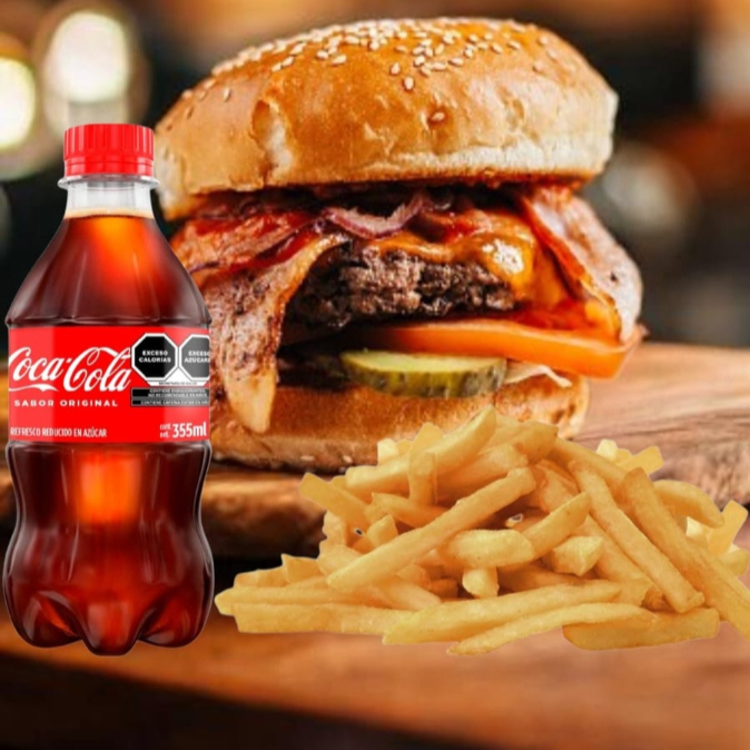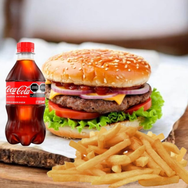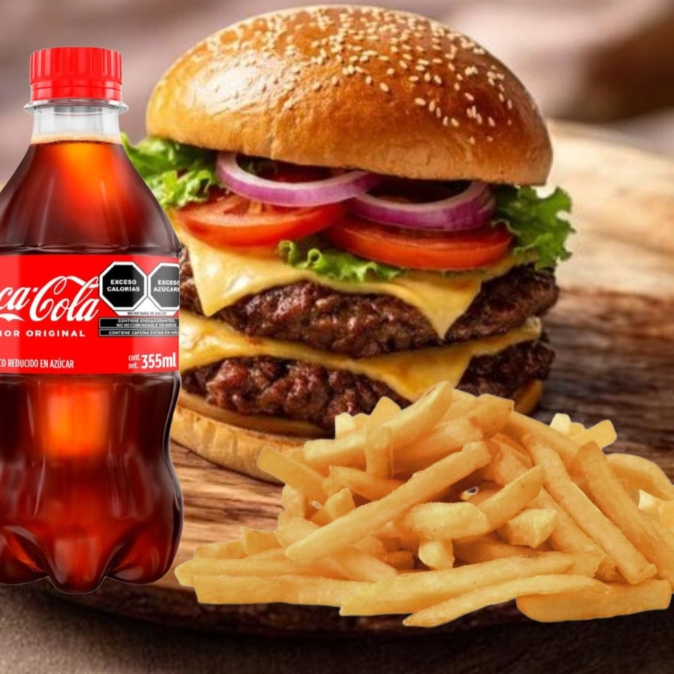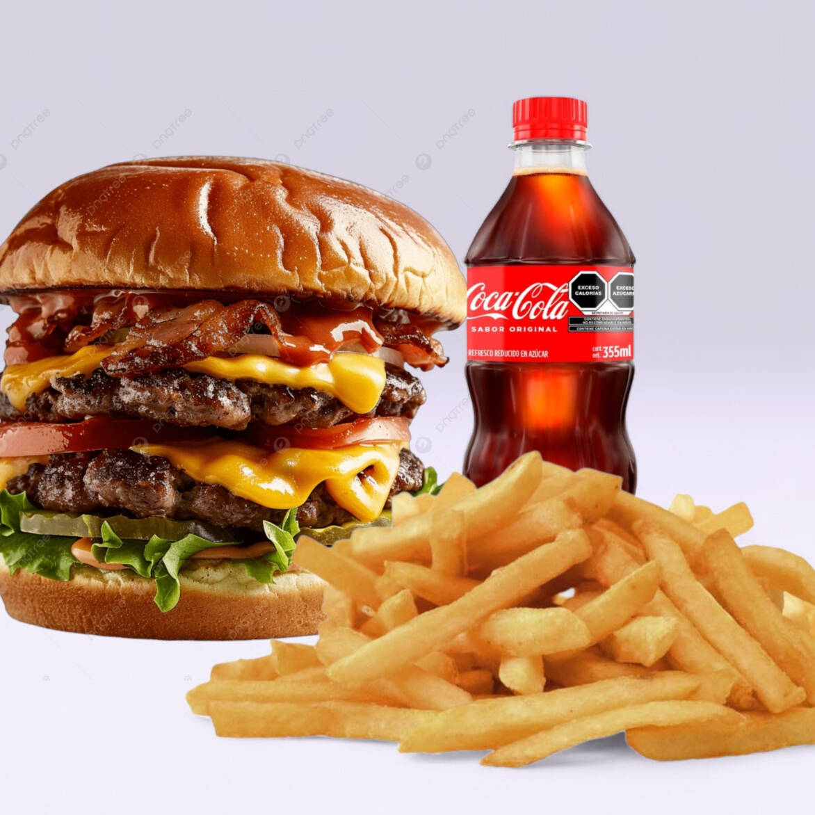 DELICIOSA HAMBURGUESA CON DOBLE CARNE EN COMBO CON PAPAS Y COCA COLA