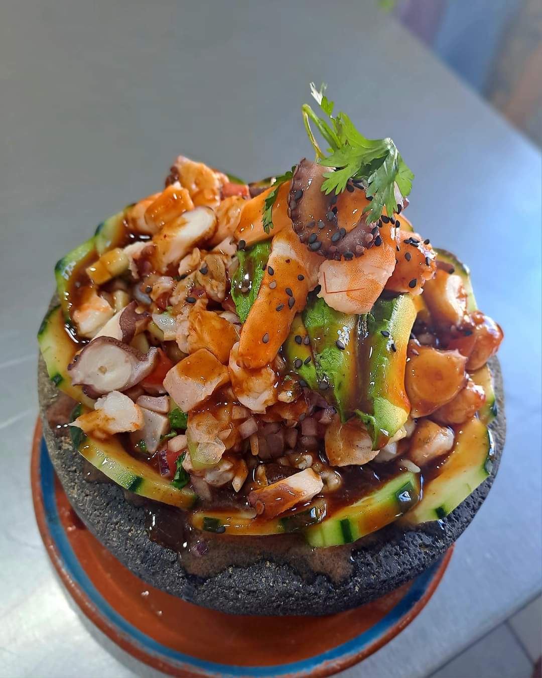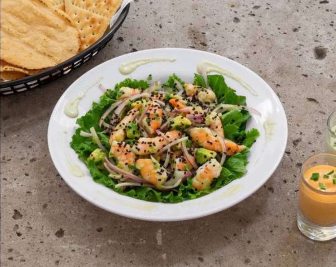Con camarón fresco recién cocido, mezclado con cubitos de aguacate, cebolla blanca y morada, lechuga fresca, pepino, aderezo verde y un toque de aceite de oliva y ajonjolí negro incluye tostadas galletas aderezo de cilantro y salsa.