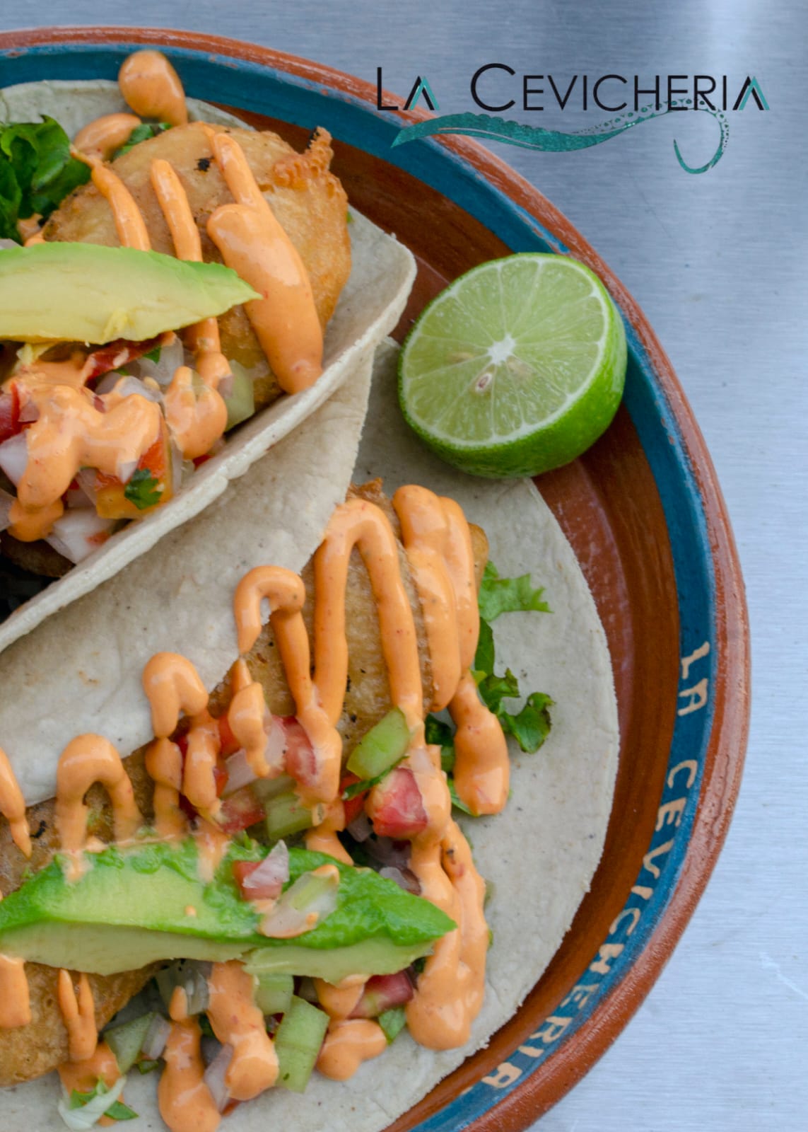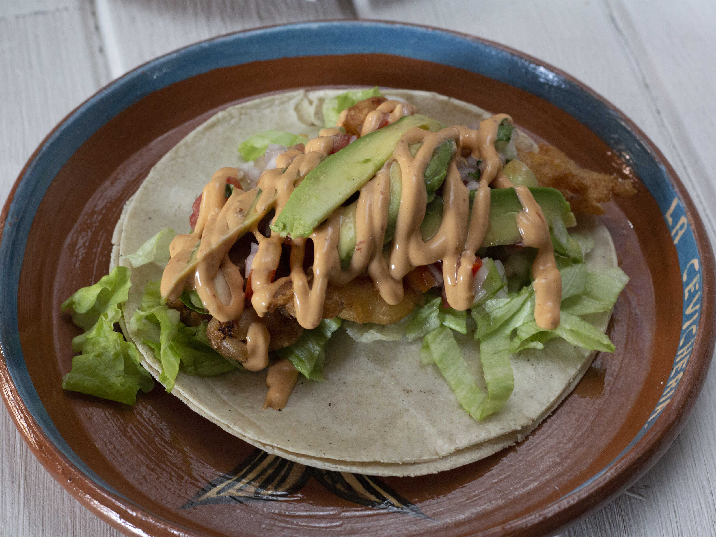 Fresco camarón o pescado rebozado en una tempura de cerveza y mostaza, acompañado de lechuga, salsa pico de gallo y aderezo de chipotle.