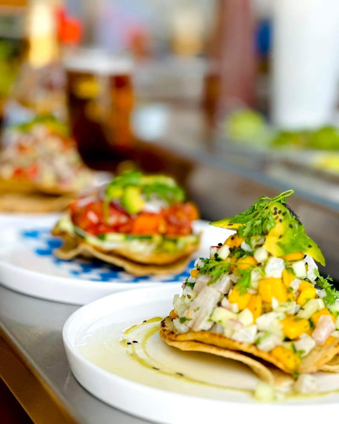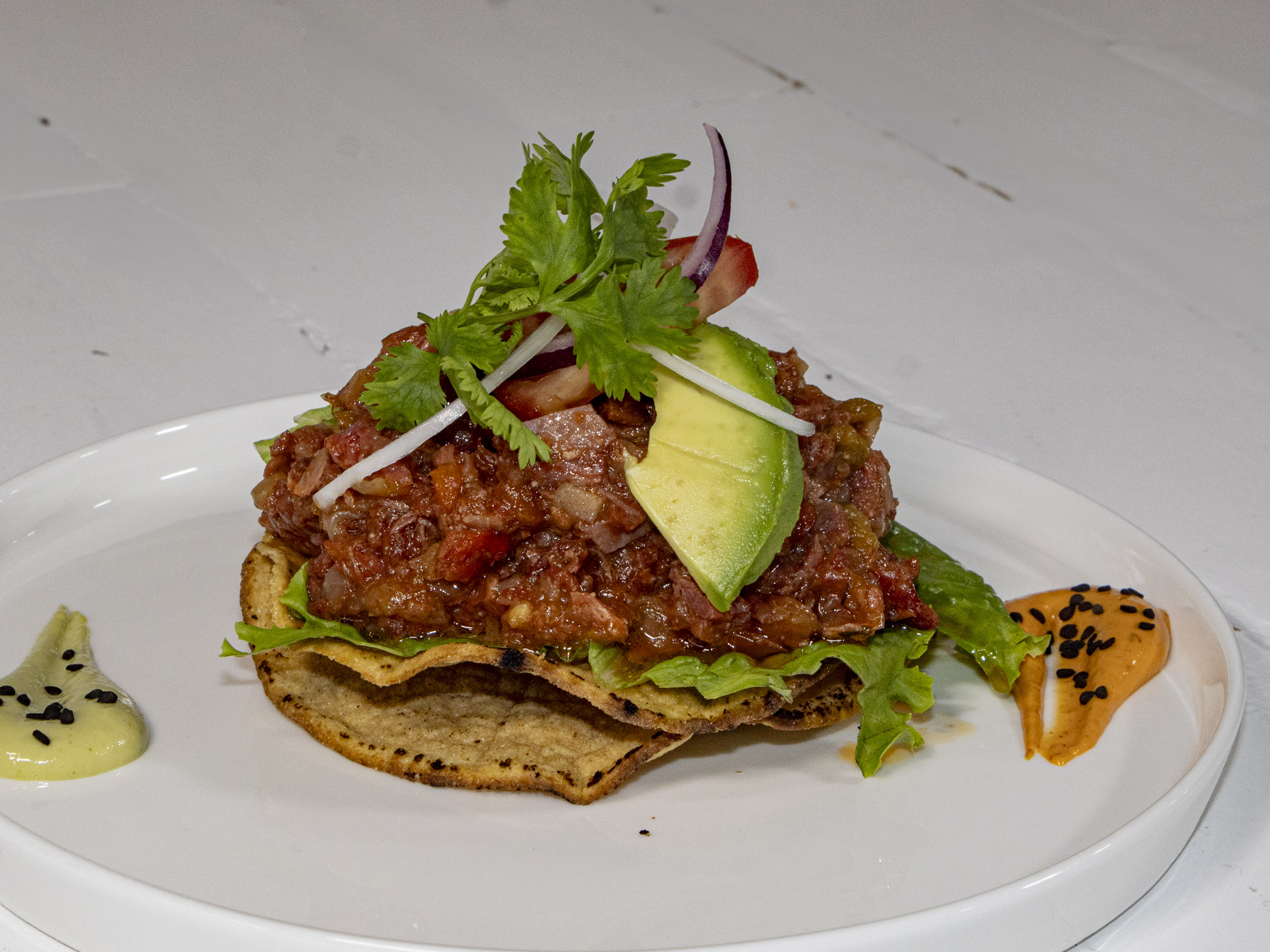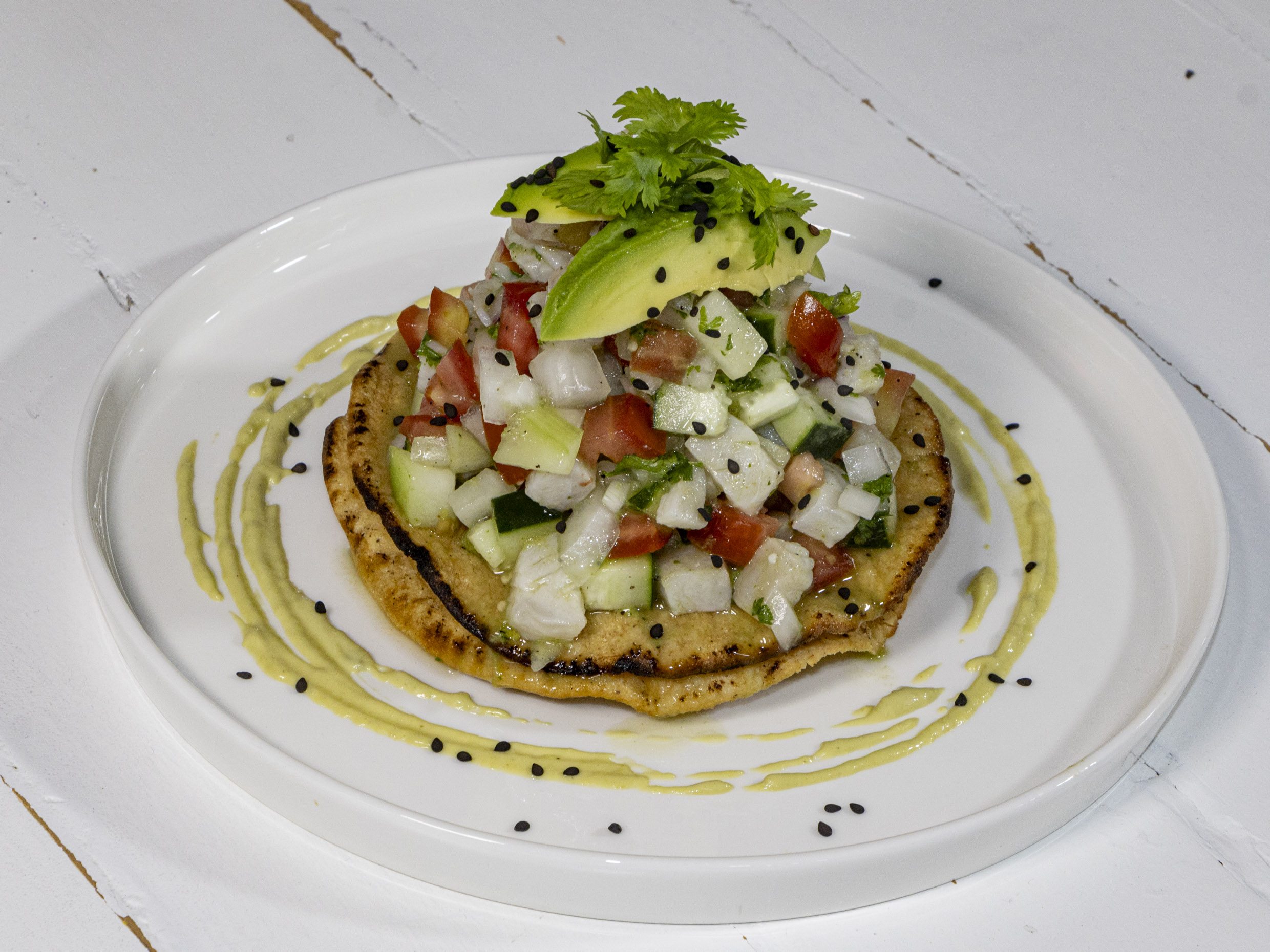 Tostada de camarón fresco con cubos de aguacate, cebolla, pepino, acompañado e una emulsión de no, vinagreta de agria, lechuga ajonjolí negro.