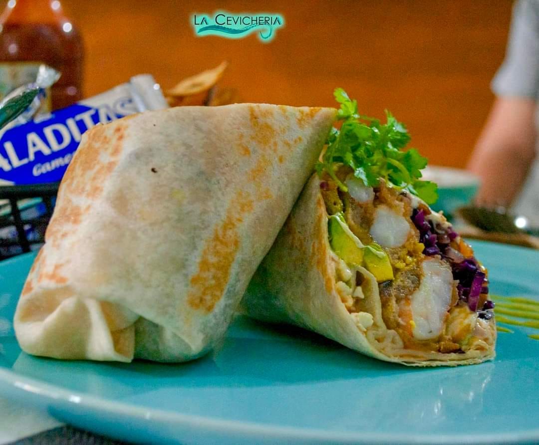 Exquisito burrito estilo baja con ensalada semifría, camarones rebozados, frijol refrito con chipotle, queso oaxaca. Tortilla de harina gigante.
