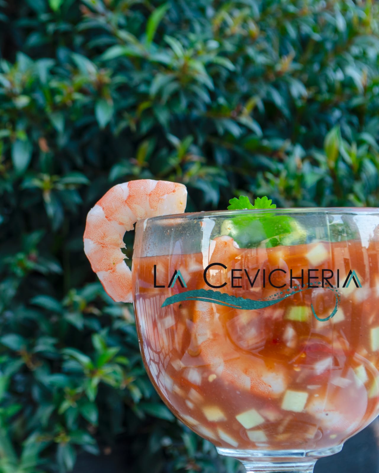 Camarones marinados en jugo de limón y salsa marisquera negra con un mix de cebolla pepino y aguacate. Incluye tostadas, galletas, cilantro y salsa.