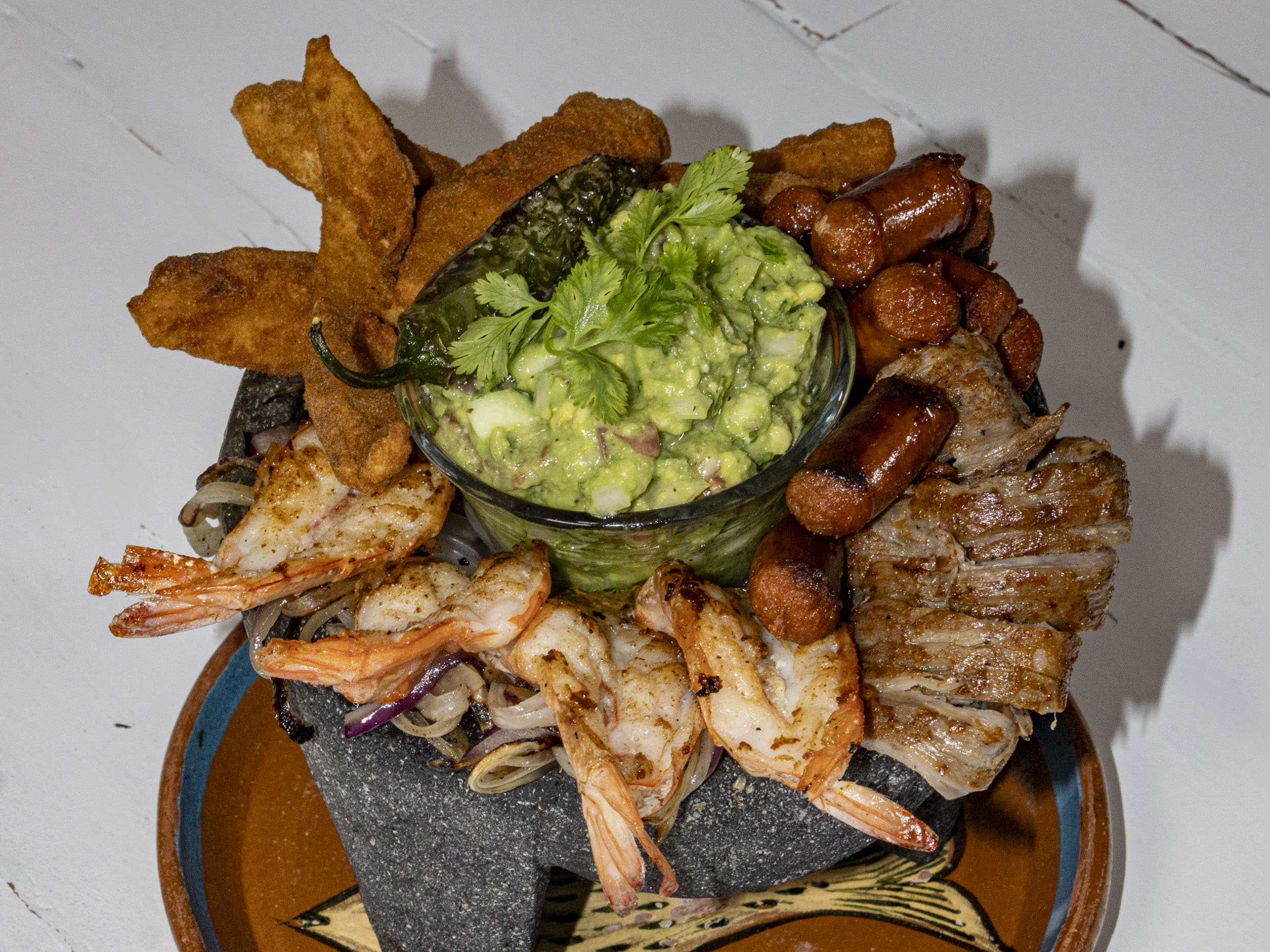 Camarón rebozado, acompañado de lechuga, jitomate, cebolla, cilantro, pepino y chile serrano, acompañado de limón y aderezo de chipotle.