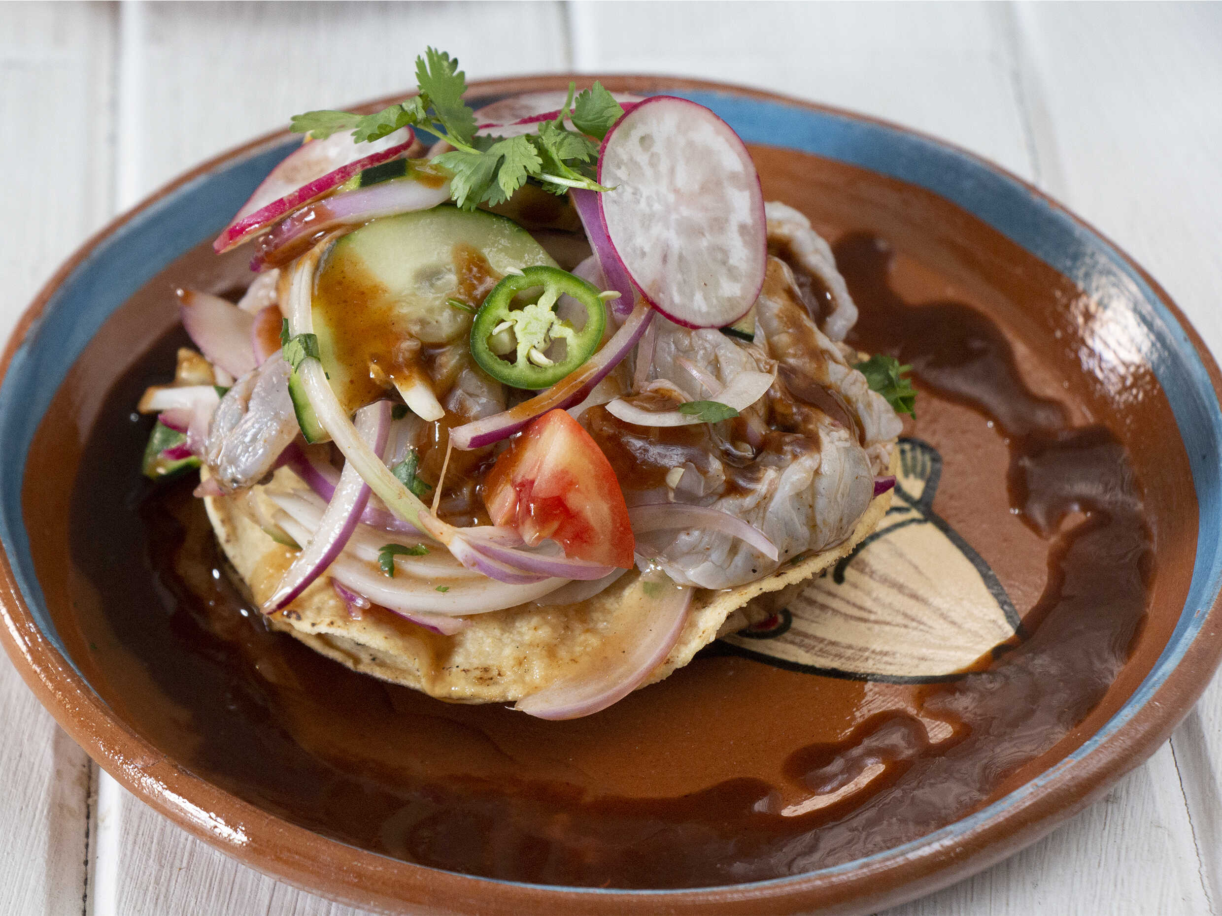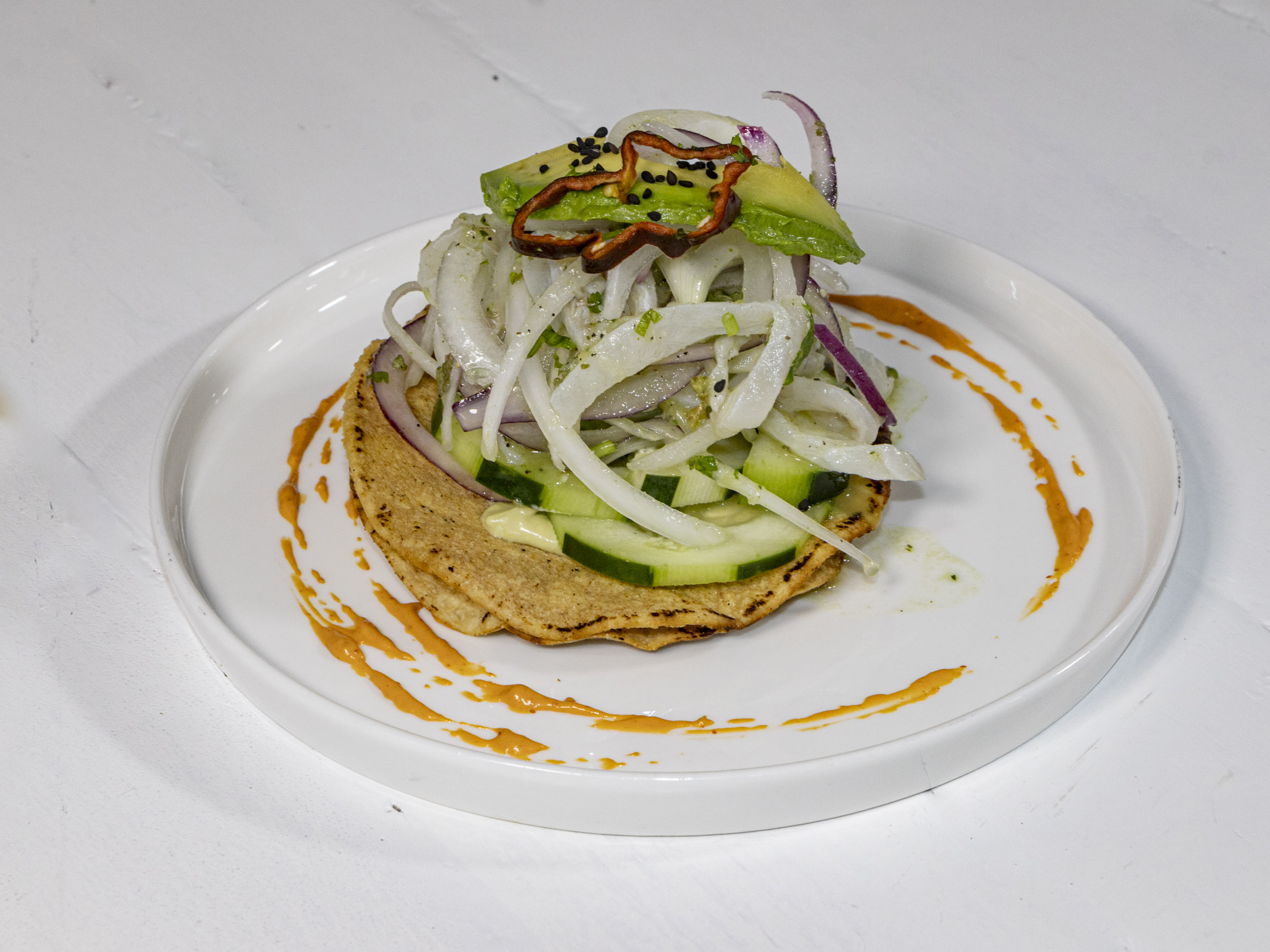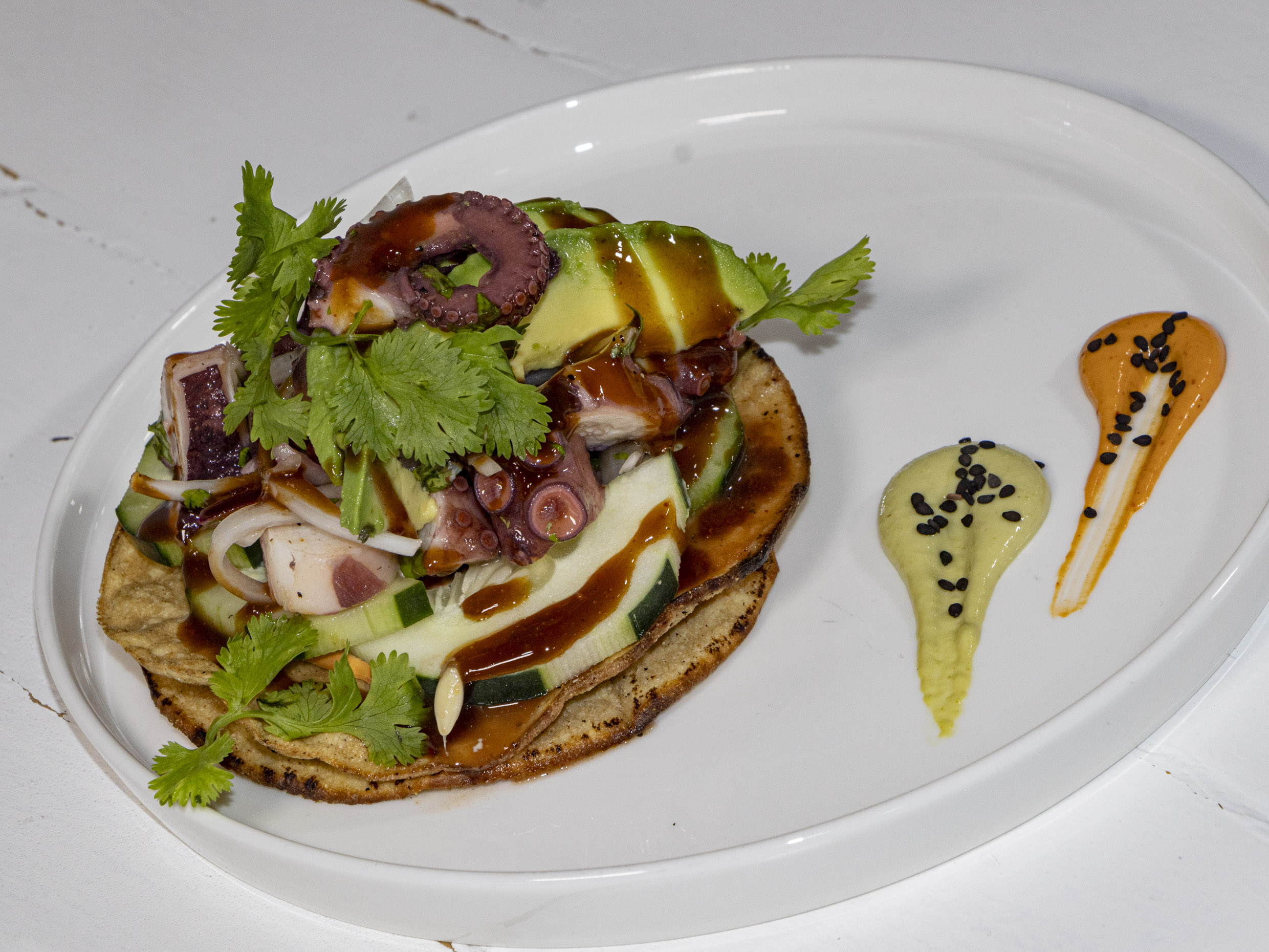 Delicioso taco de machaca de pulpo acompañado de ensalada fresca y salsa de aceite de chile morita y cacahuate.